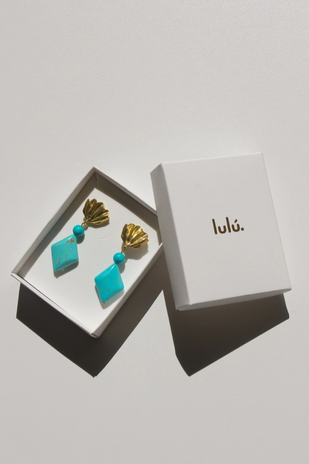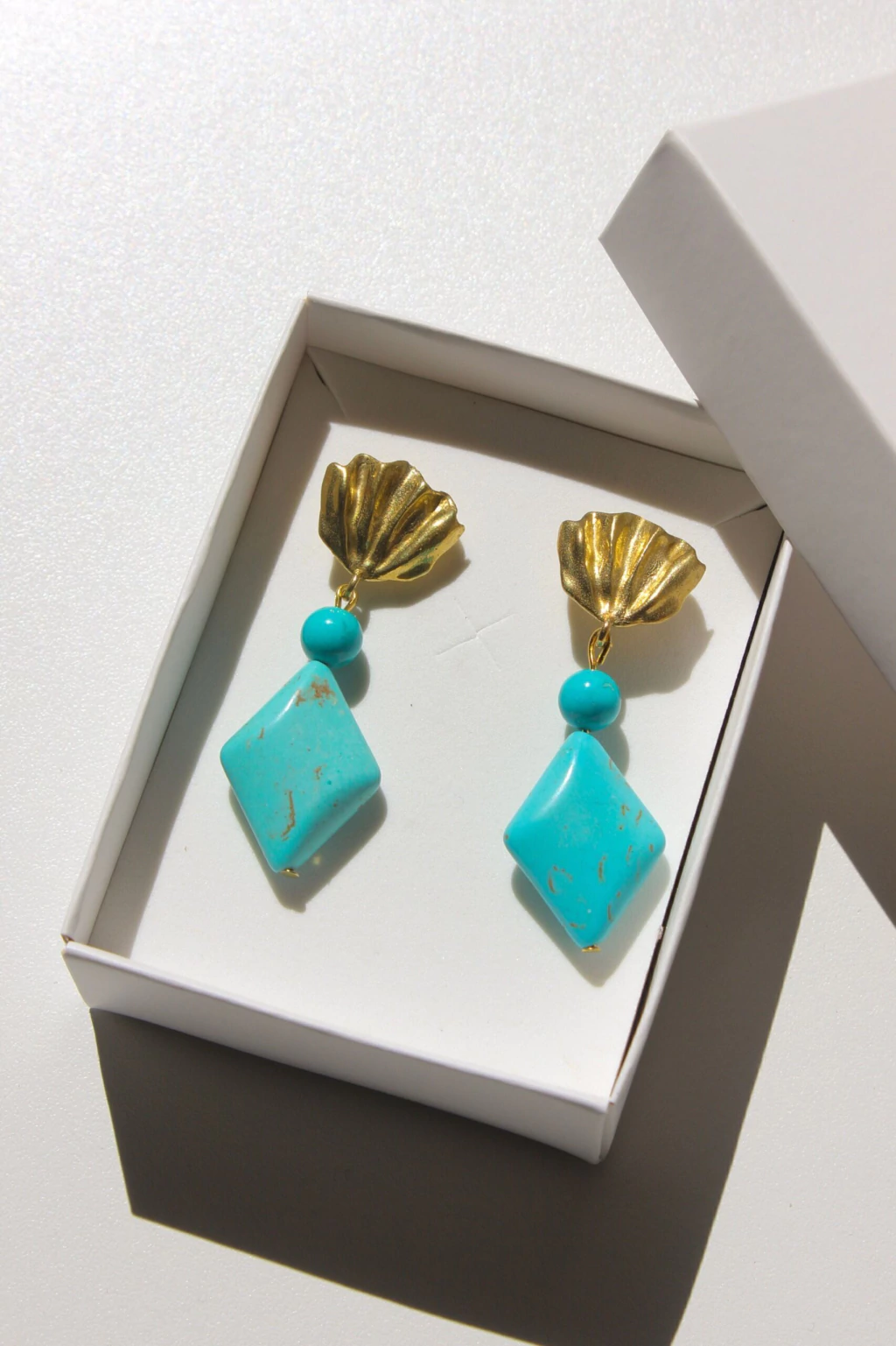 Los aros Turquesa estan realizados de manera artesanal, cuya base es un conchilla de bronce unido con un piedra natural en forma de rombo y cuenta redonda en color turquesa.