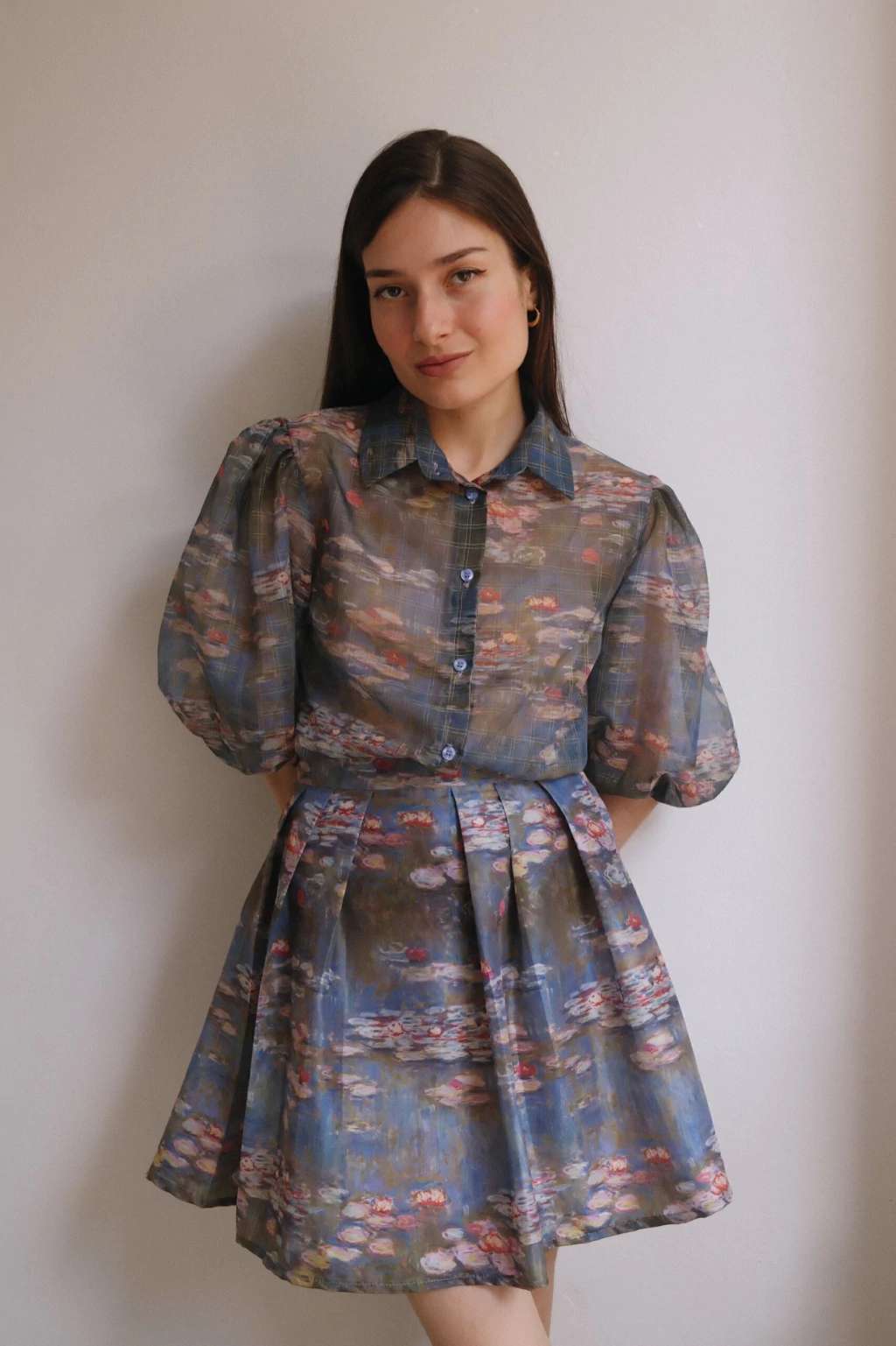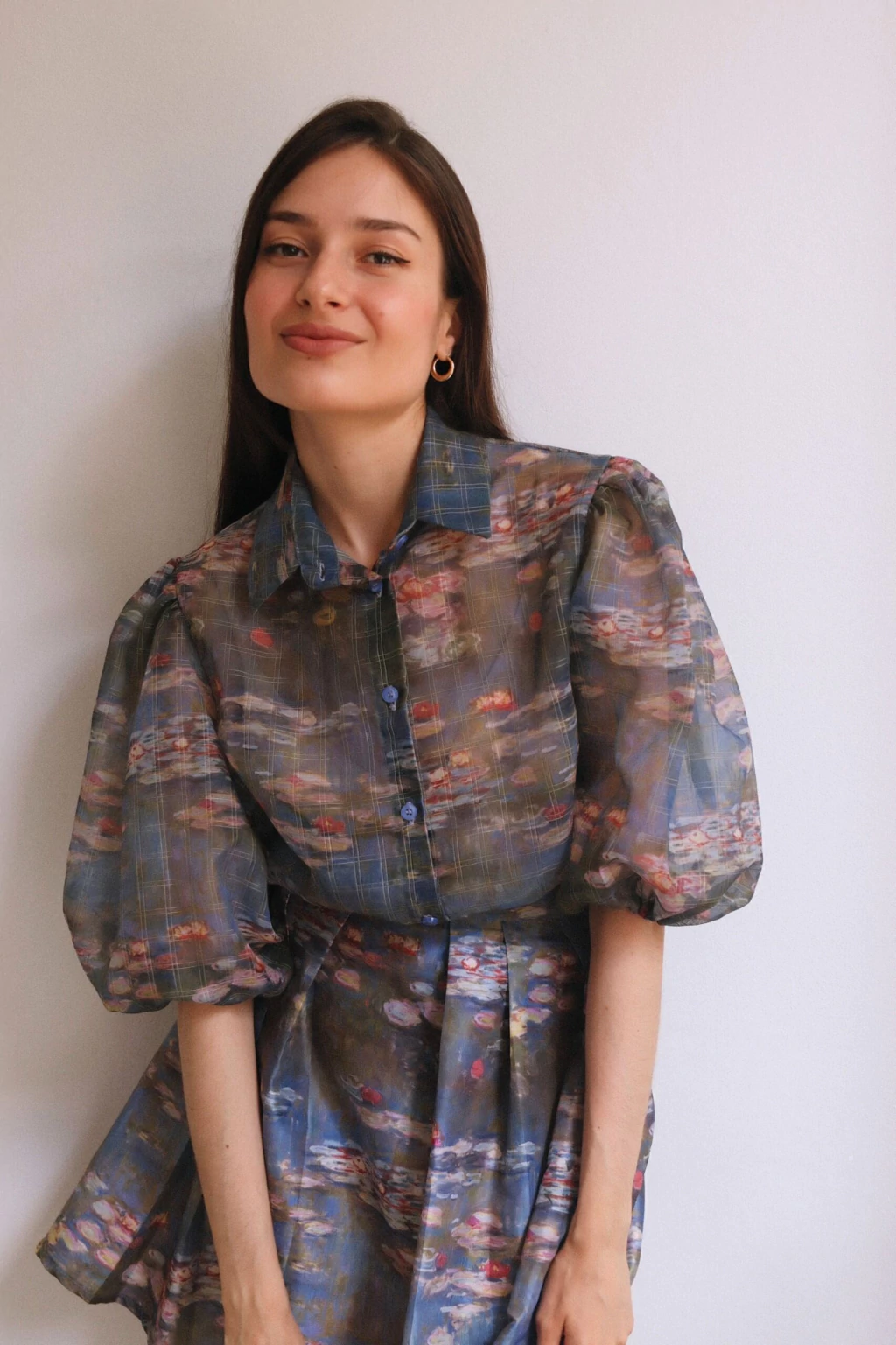 La camisa Lilies posee una estampa exclusiva de la marca, inspirada en los nenúfares que pintaba Monet. Tiene largo a la cadera y viene con mangas con frunce en hombro y puño, muy románticas. Tiene un elástico al final de la manga que hace que se sostenga el armado de la misma. Posee una cartera con botones a tono.