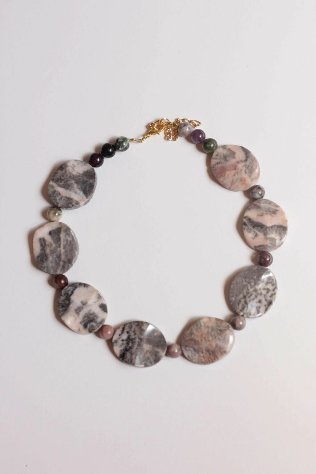 Está mezclado con cuentas redondas de ágata. El cierre es regulable.