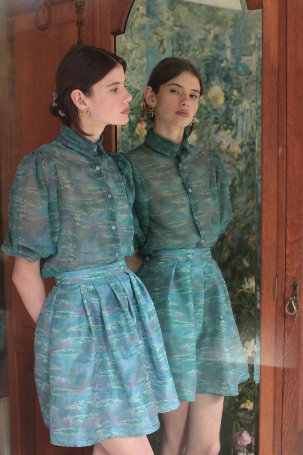La falda Monet posee una estampa exclusiva de la marca, inspirada en los nenúfares que pintaba Monet. Es una falda ajustada en cintura con corte evasé, con tablas en el delantero y espalda. Posee un cierre invisible en la espalda y cintas para colgar en percha. Sugerimos elegir tu talle, o si estas entre dos talles elegir el mas grande.