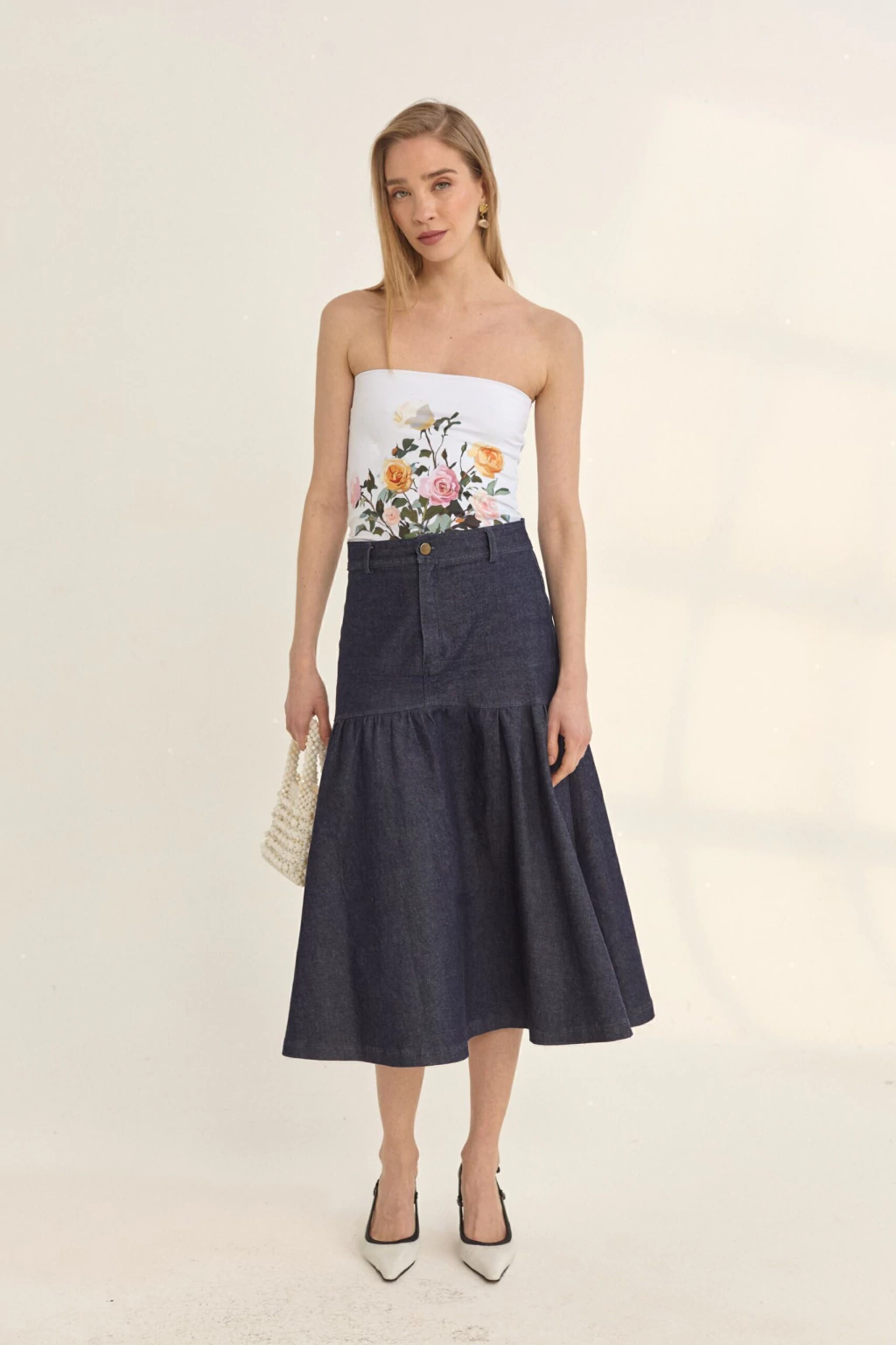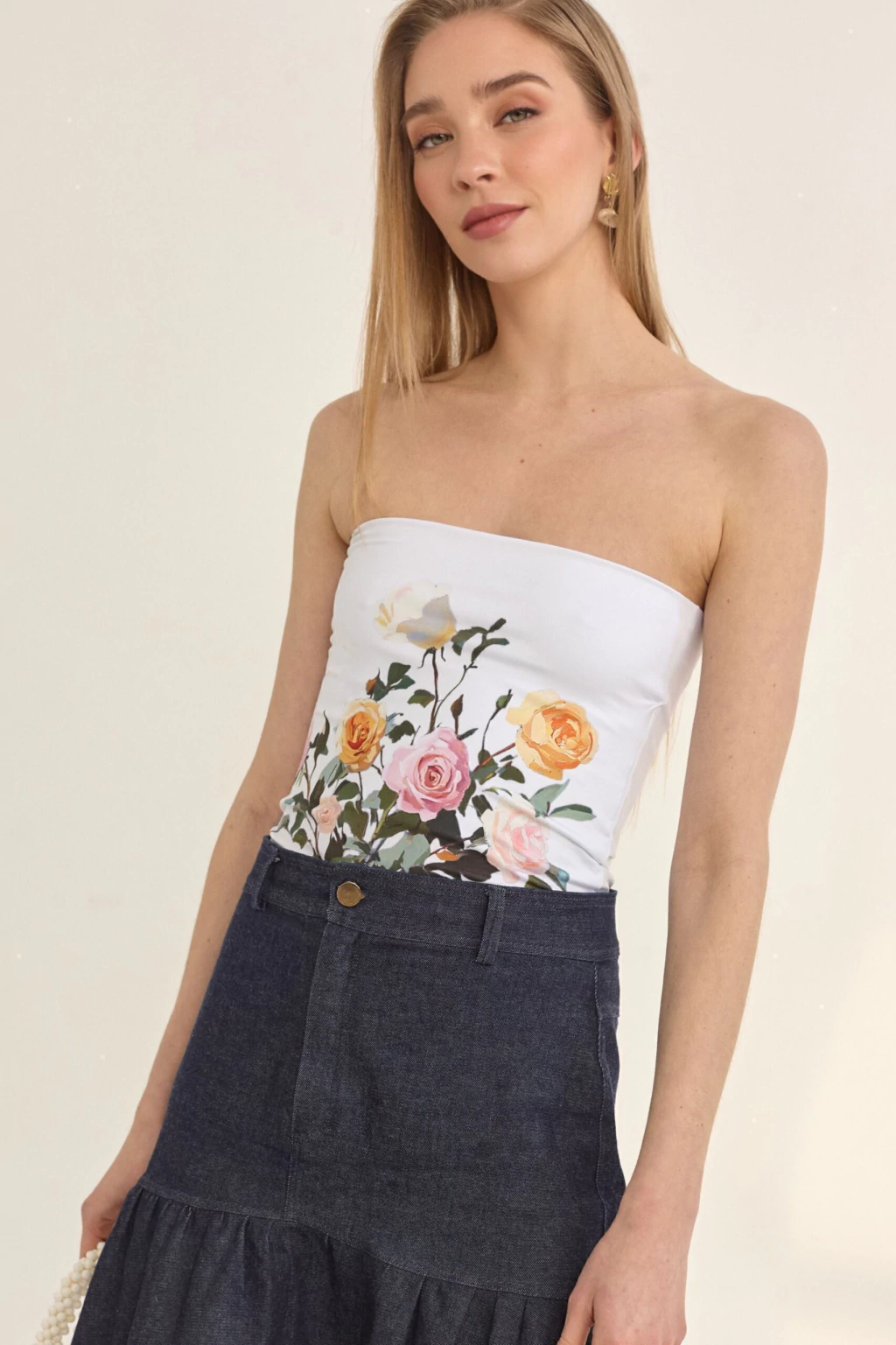 El top Bouquet negro tiene una estampa única exclusiva de Lulú. Es un top strapless entallado que llega a la cintura. El textil es micropluma de poliester, suave al tacto. Si estás entre dos talles recomendamos elegir el más grande ya que se adapta al cuerpo.