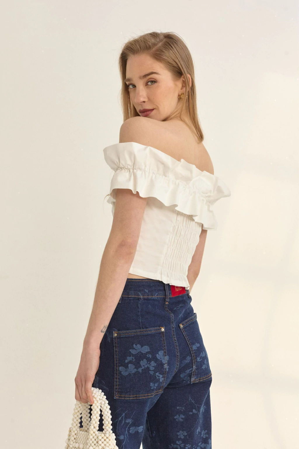 El top Macarón blanco es un top sin mangas ni hombros, con un escote bajo que genera frunce, ortogándole un volumen bien femenino. En el centro de la espalda posee un recorte con hilo elastico que permite que la prenda se adapte bien a cualquier cuerpo.