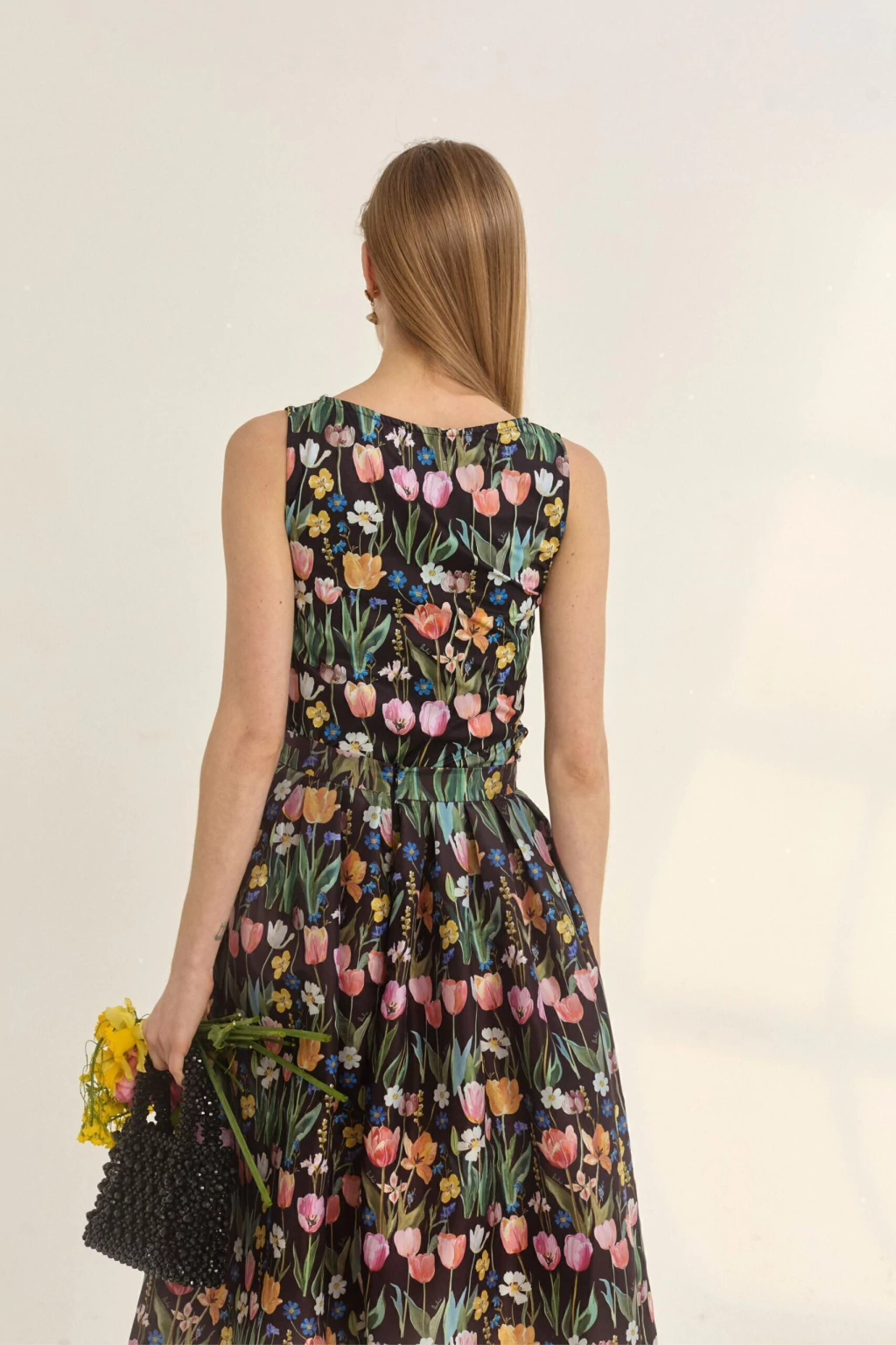 El vestido Tulipán posee una estampa por metro exclusiva de Lulú, inspirada en los tulipanes franceses. Tiene una pechera entallada con breteles de la misma tela, una falda evasé con frunce en cintura y un cierre en centro de la espalda como acceso.