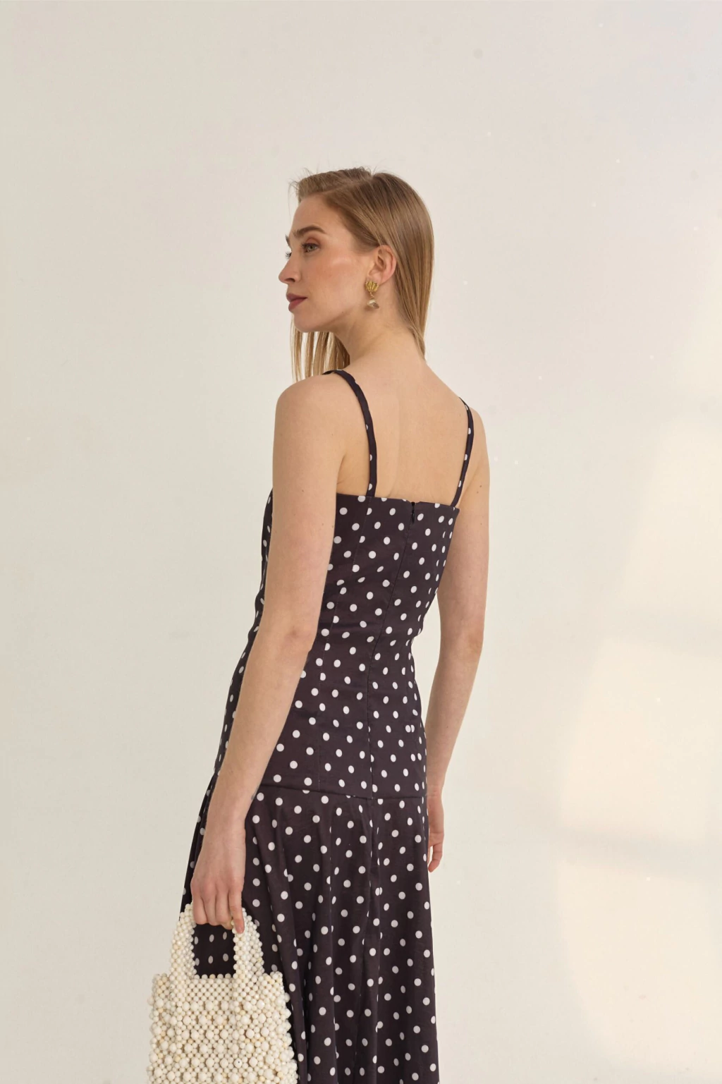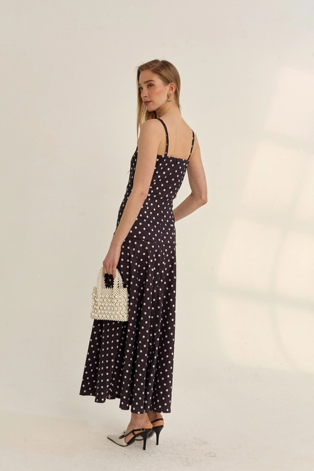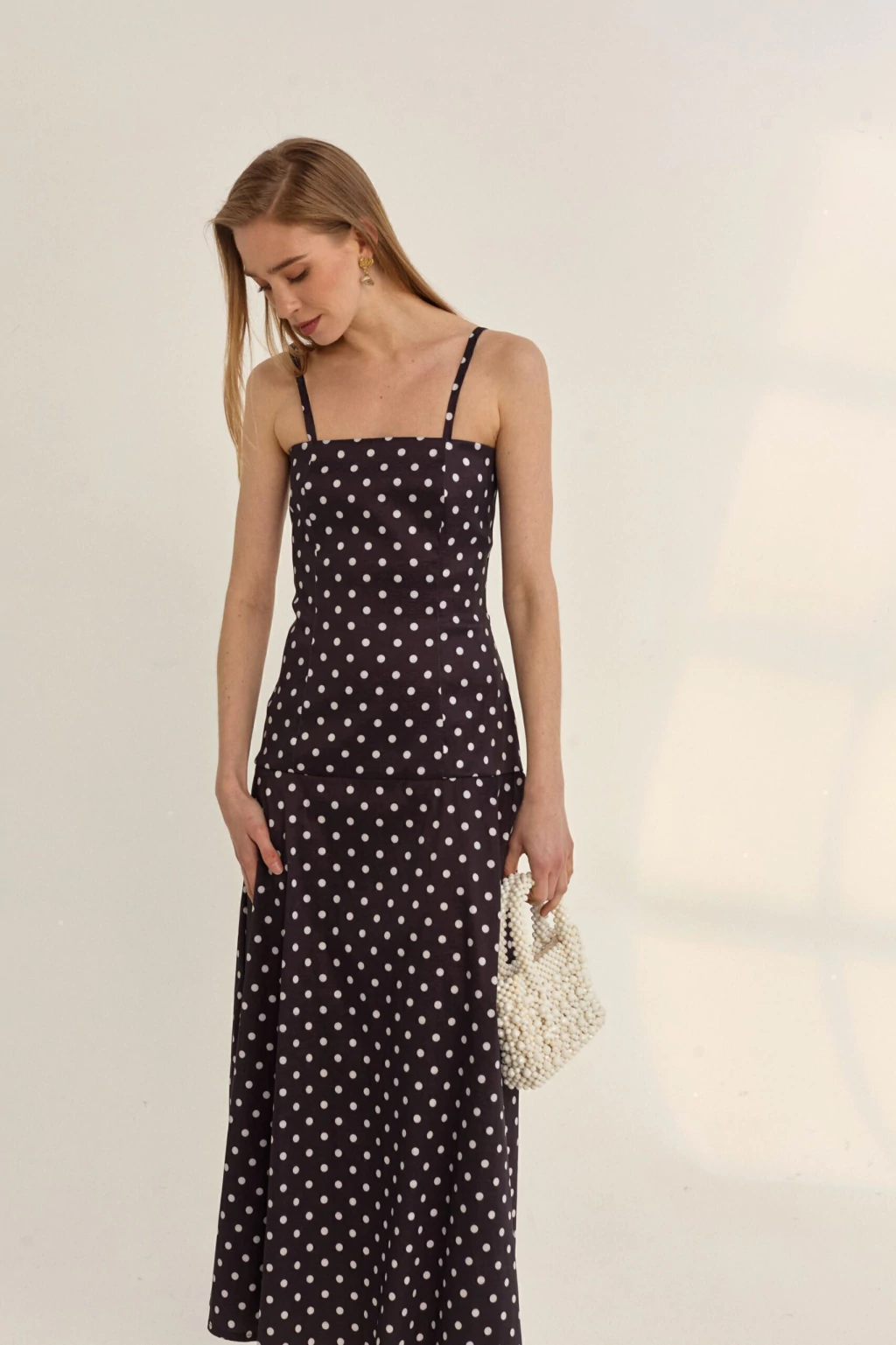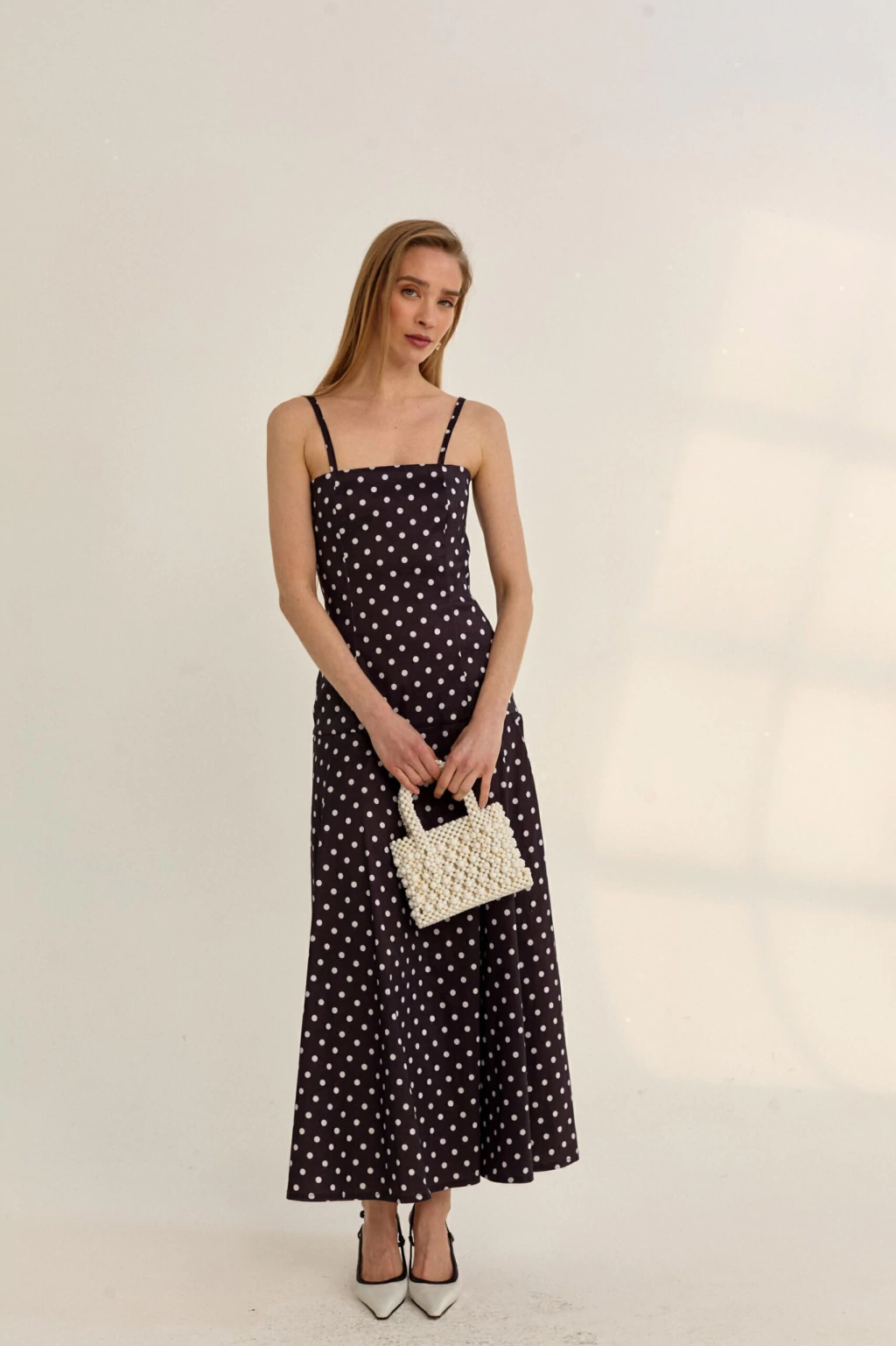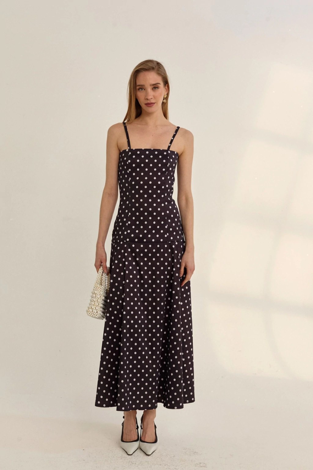El vestido Anna Karina posee una estampa por metro esclusiva de Lulú, nuestro clásico polka de esta colección. Es un modelo largo, entallado hasta la cadera, con breteles y un cierre en el centro de espalda como acceso. La falda es evasé, con una silueta muy en tendencia. La tela base es un tafetán con lycra que se adapta al cuerpo, por lo que te recomendamos que si estás entre dos talles elijas el más grande.
