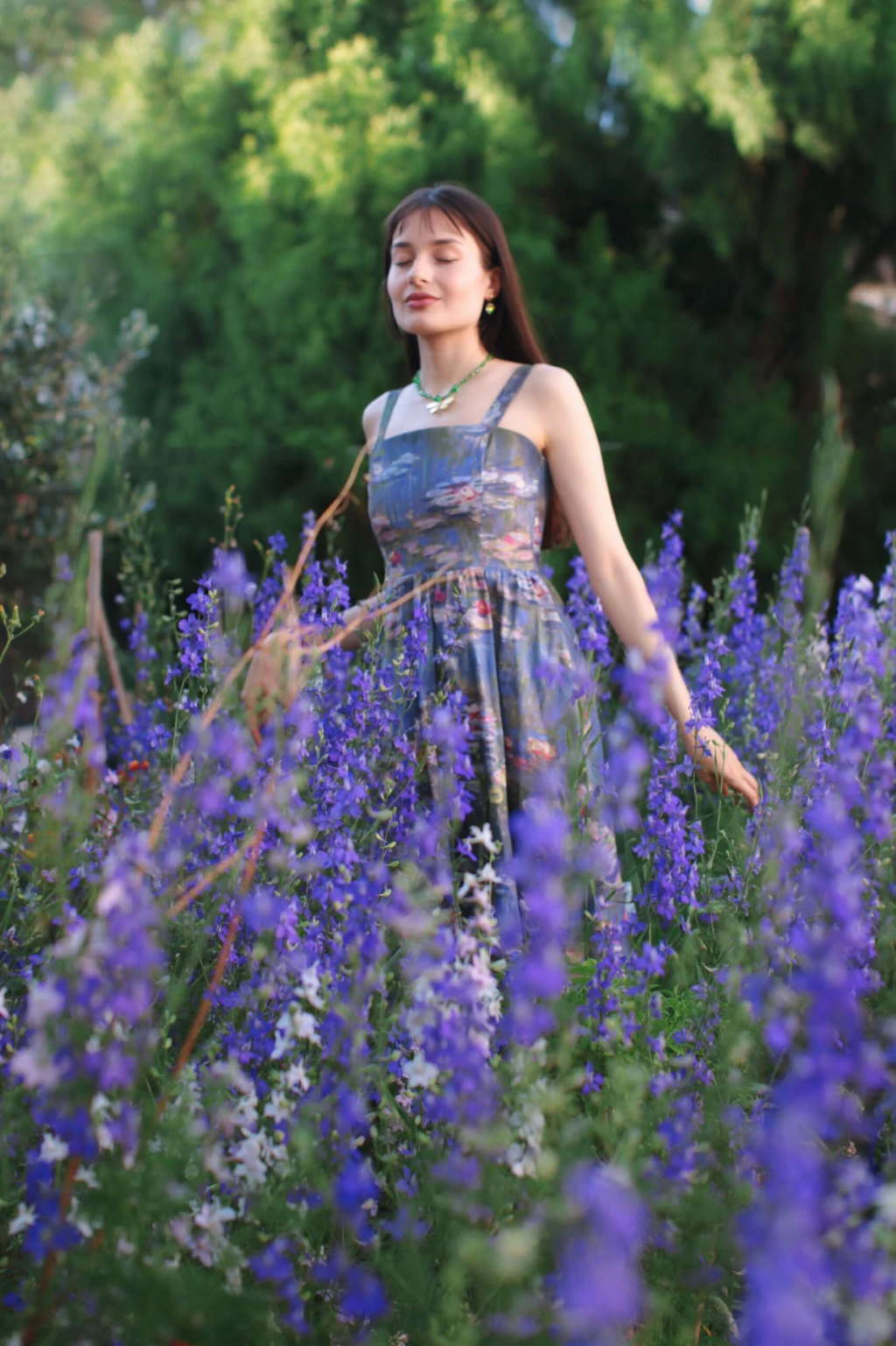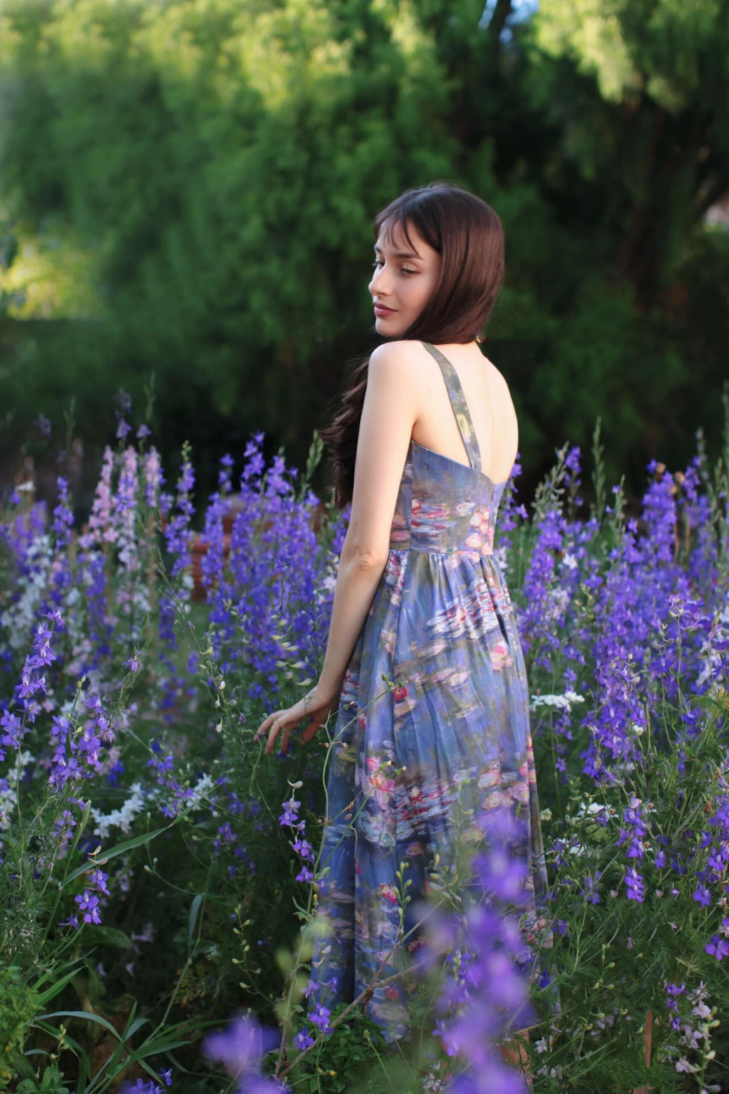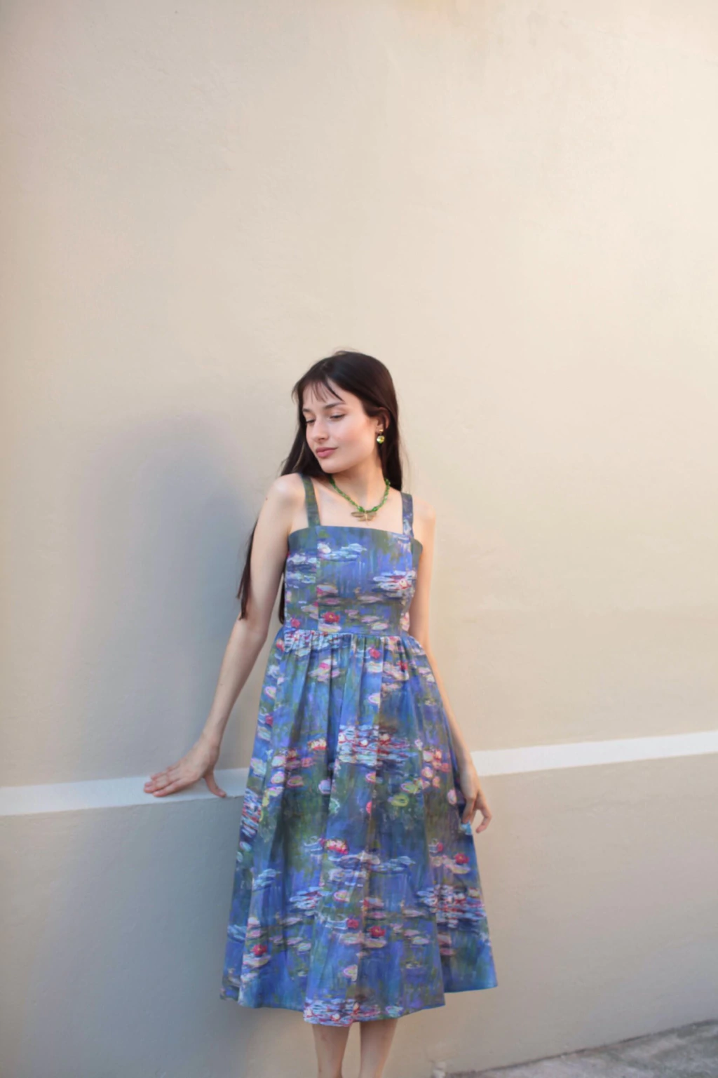 El vestido Lilies posee una estampa por metro exclusiva de Lulú, inspirada en los cuadros de Claude Monet. Tiene una pechera entallada con breteles de la misma tela, una falda evasé con frunce en cintura y un cierre en centro de la espalda como acceso. Su textil base es un tafetán con lycra, lo cual hace que sea un modelo que se adapta muy bien al cuerpo. Te recomendamos elegir tu talle en base a tu medida de busto y cintura, para un mejor calce.
