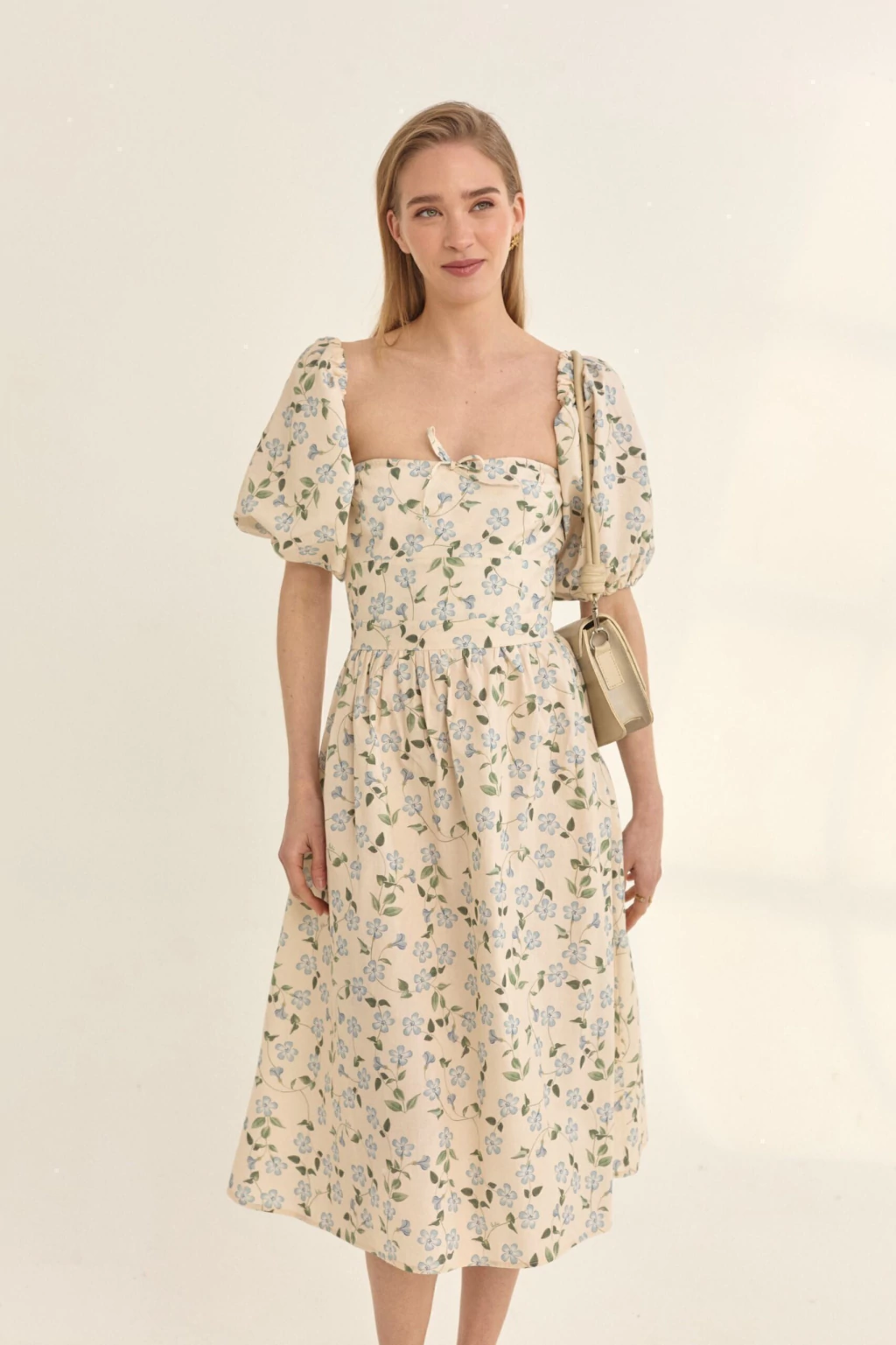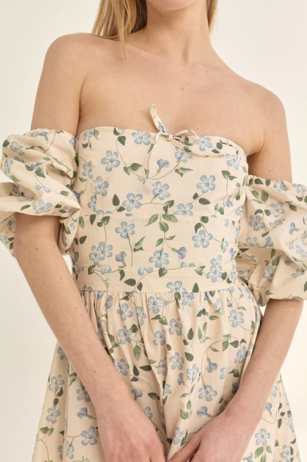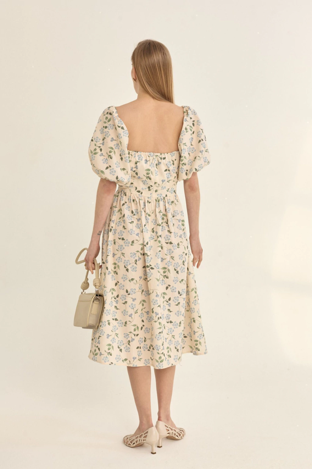 El vestido No me olvides posee una estampa por metro exclusiva de Lulú, inspirada en la flor "no me olvides". Tiene un corte a la cintura, y una falda larga evase. Las mangas son abullonadas y tienen un elastico para sostener su forma en el hombro y en el brazo. El contorno del busto tiene un elastico y un cordon de la misma tela que ayuda a sostener y regular el vestido en la parte del busto. El vestido tiene un cierre invisible en la espalda, y dos cintas laterales en los hombros que se pueden utilizar para sostener el vestido en percha o para sostener las mangas en su posicion.