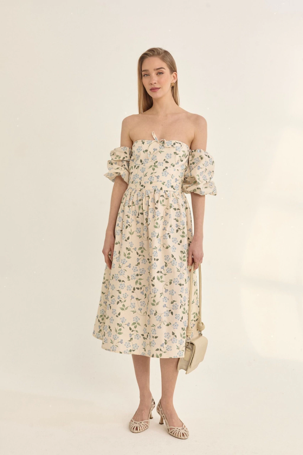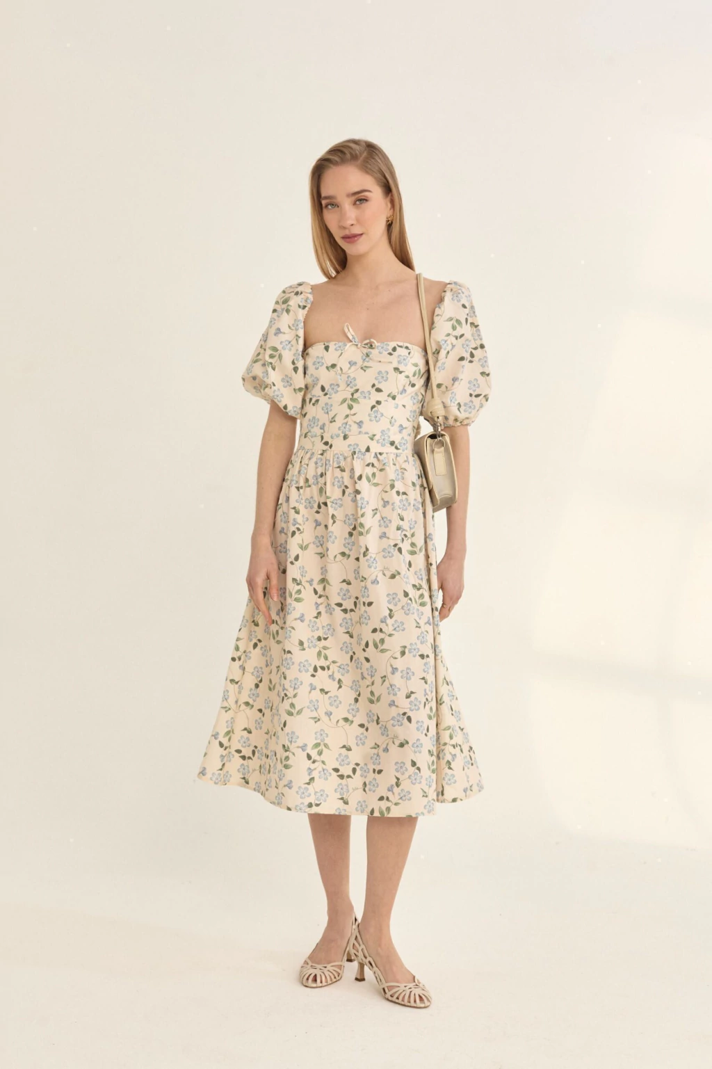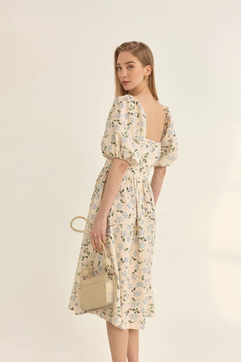 El vestido No me olvides posee una estampa por metro exclusiva de Lulú, inspirada en la flor "no me olvides". Tiene un corte a la cintura, y una falda larga evase. Las mangas son abullonadas y tienen un elastico para sostener su forma en el hombro y en el brazo. El contorno del busto tiene un elastico y un cordon de la misma tela que ayuda a sostener y regular el vestido en la parte del busto. El vestido tiene un cierre invisible en la espalda, y dos cintas laterales en los hombros que se pueden utilizar para sostener el vestido en percha o para sostener las mangas en su posicion.