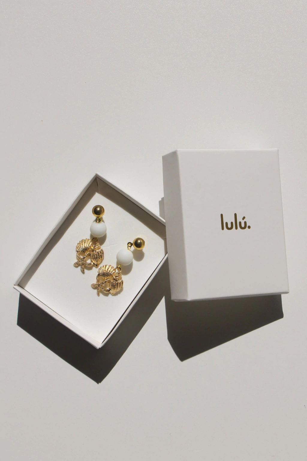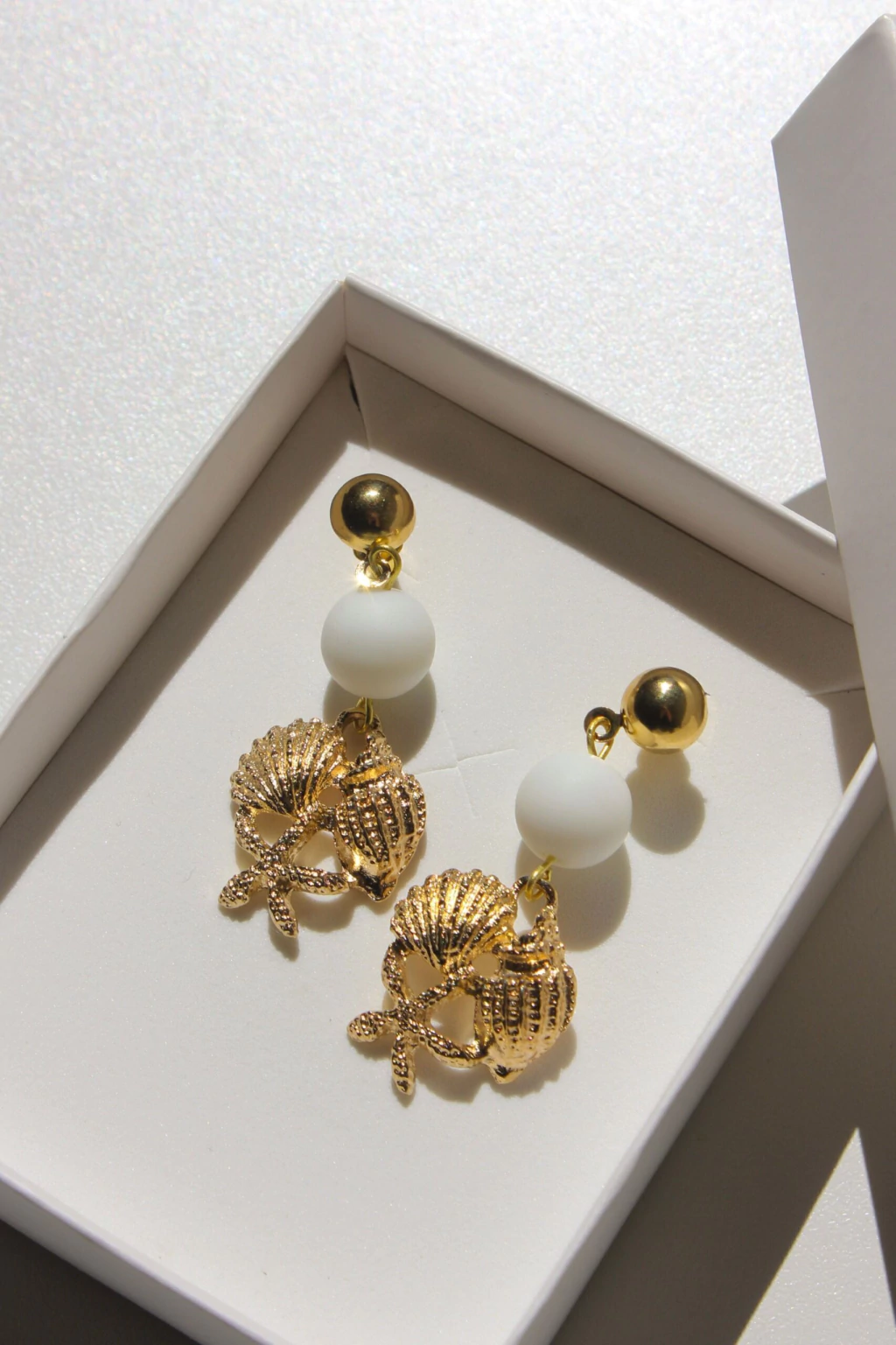 Aros con dije de caracoles y estrella de mar con terminacion de color dorado. Unido con una cuenta de priedra natural en color blanco. Perfecto para el verano, y para lucir en la playa!