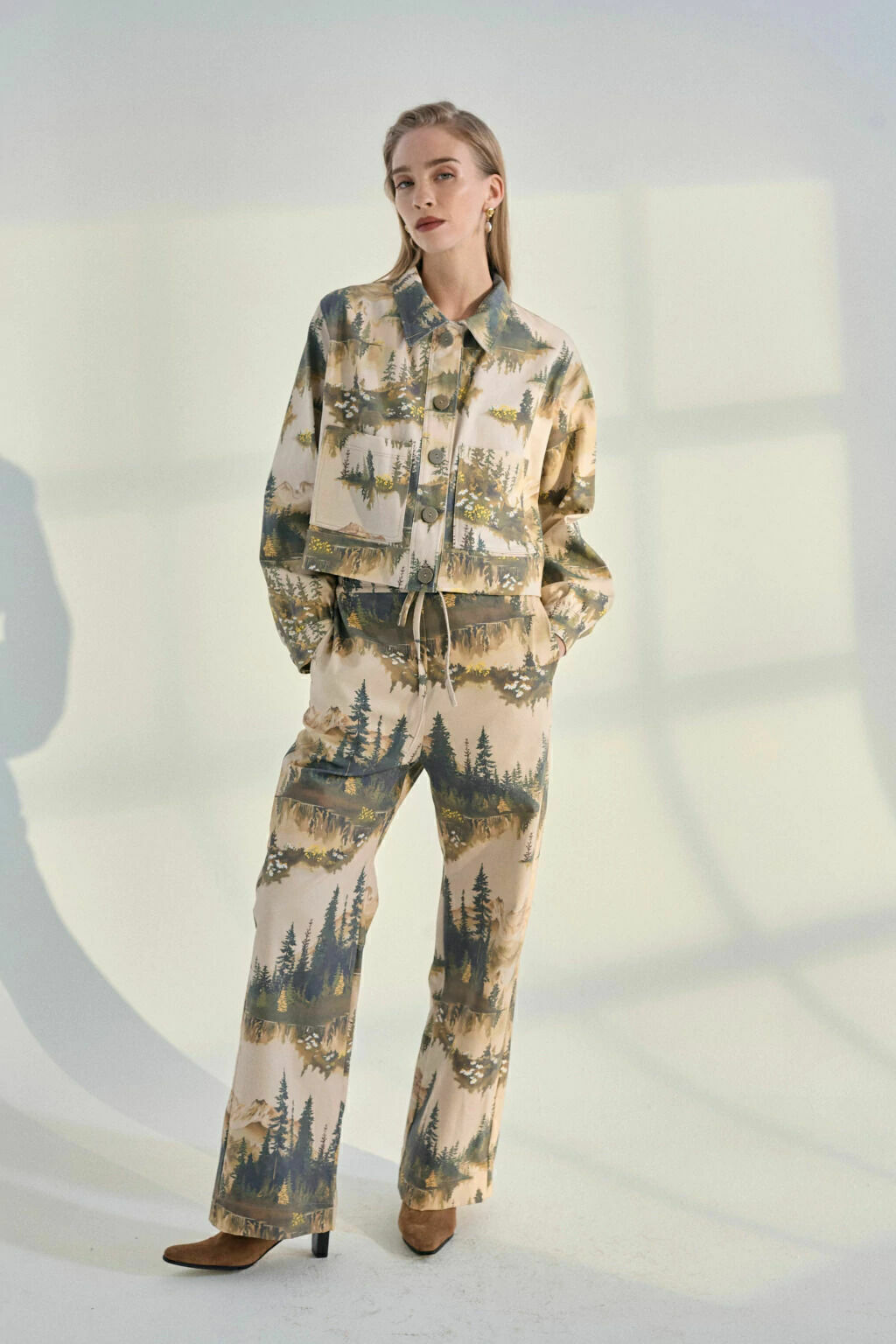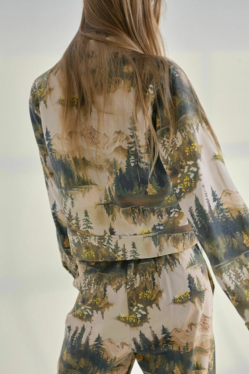 La campera Alerces esta realizada con una estampa exclusiva de la marca, ilustrando nuestros bosques y lagos.