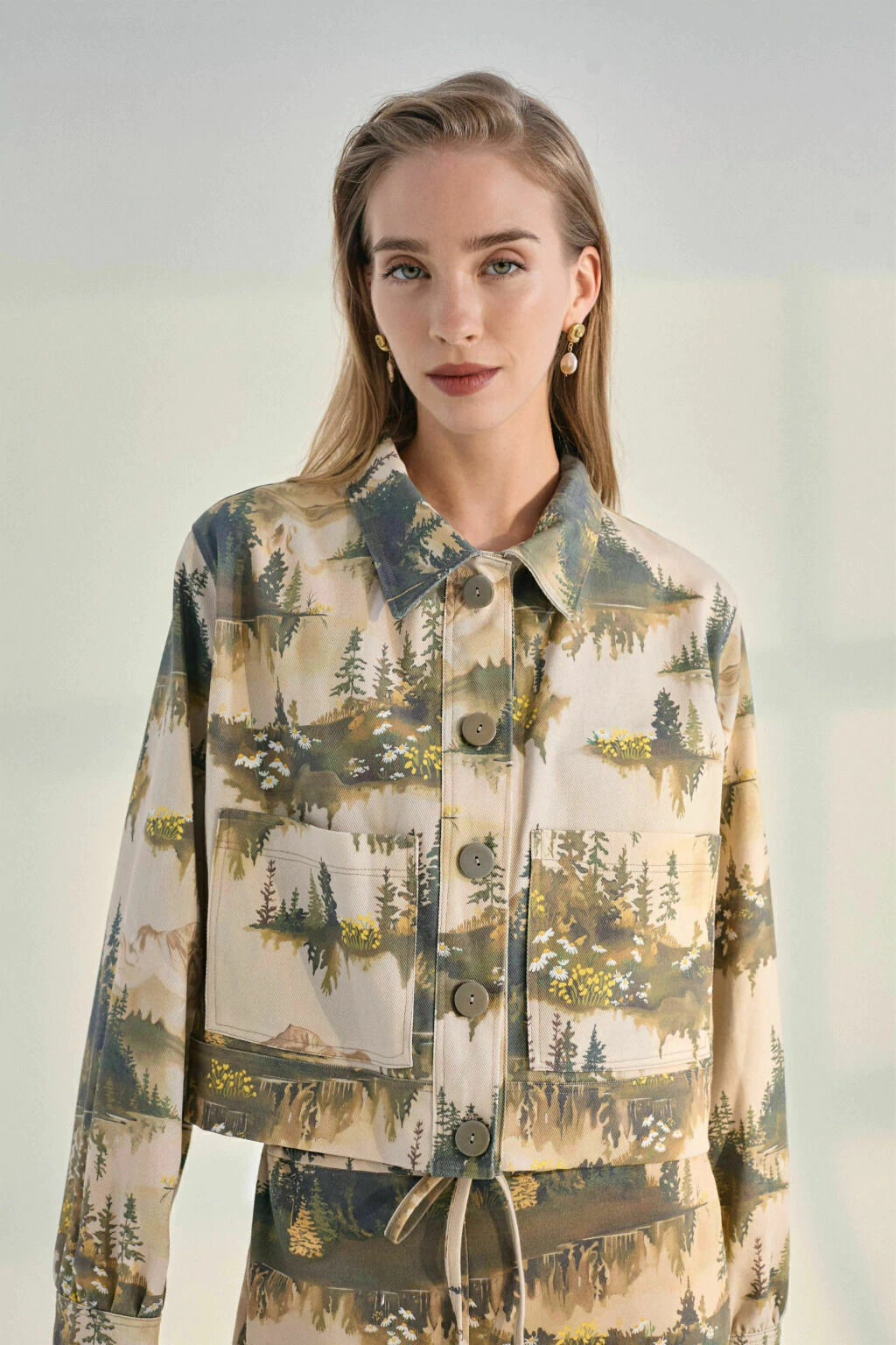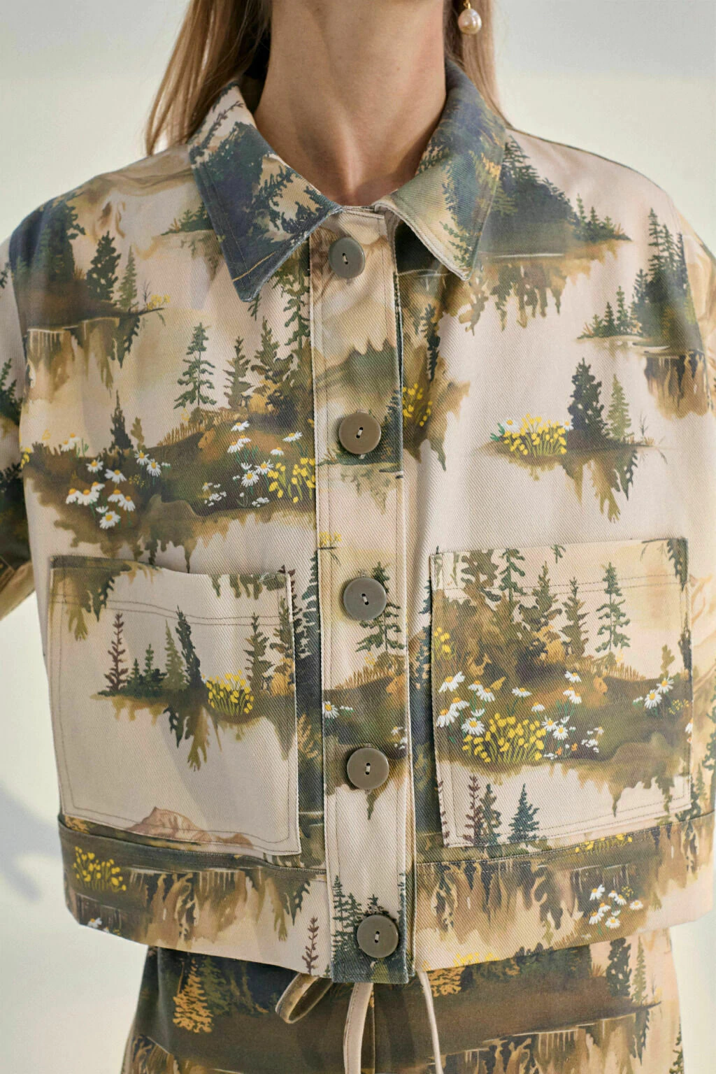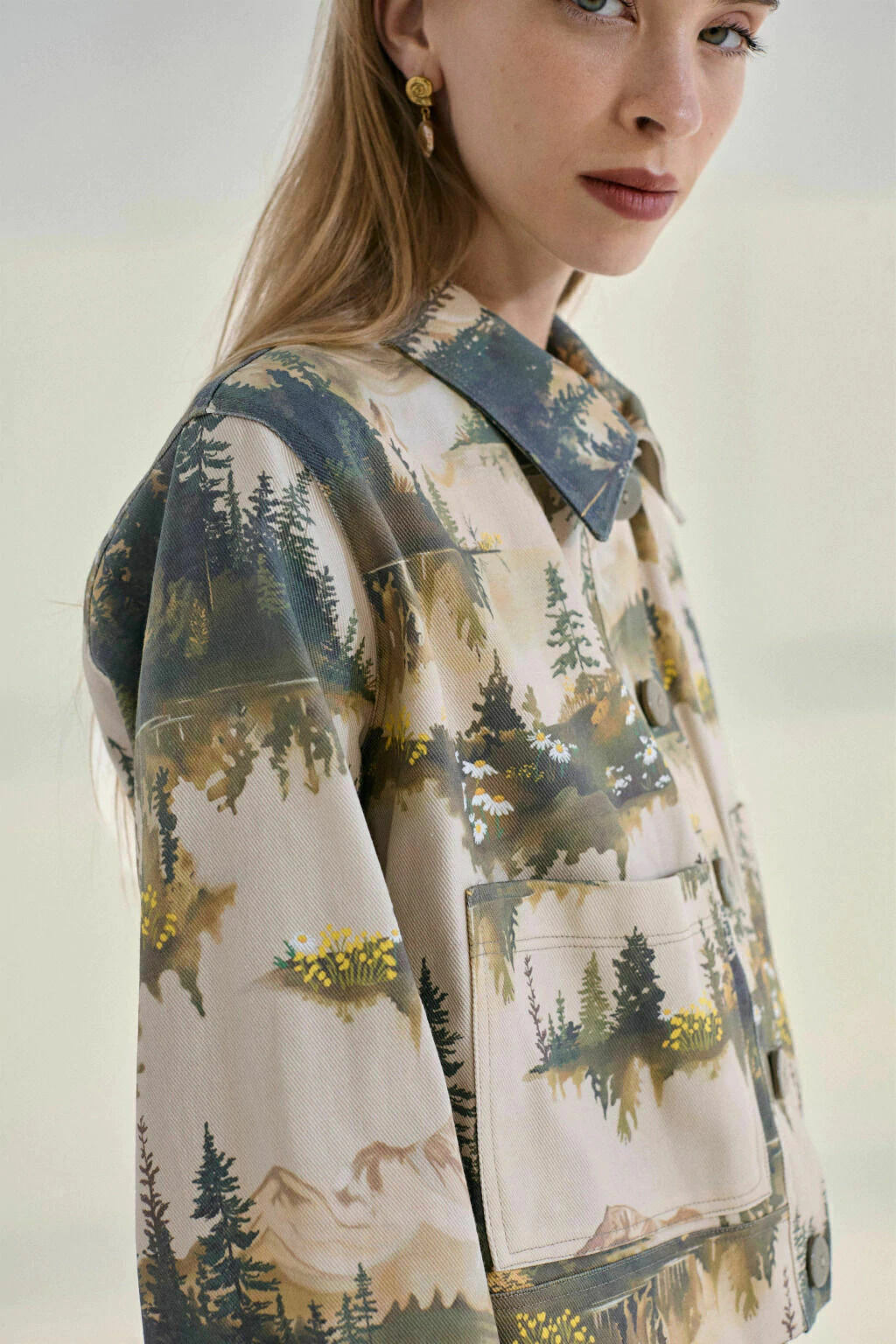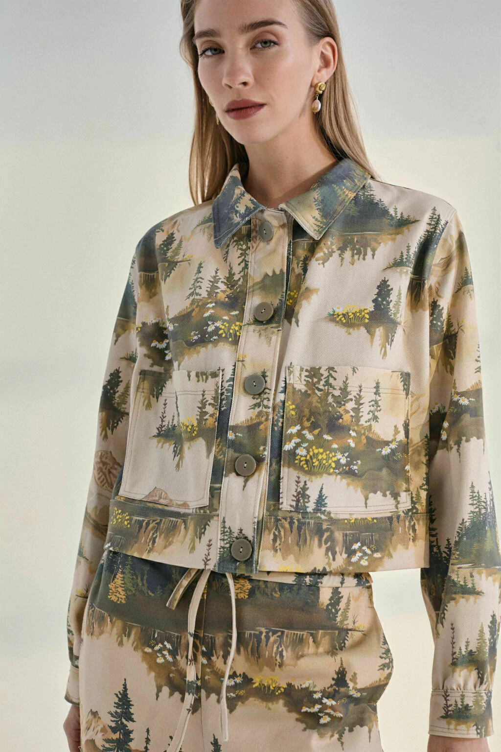 La campera Alerces esta realizada con una estampa exclusiva de la marca, ilustrando nuestros bosques y lagos.
