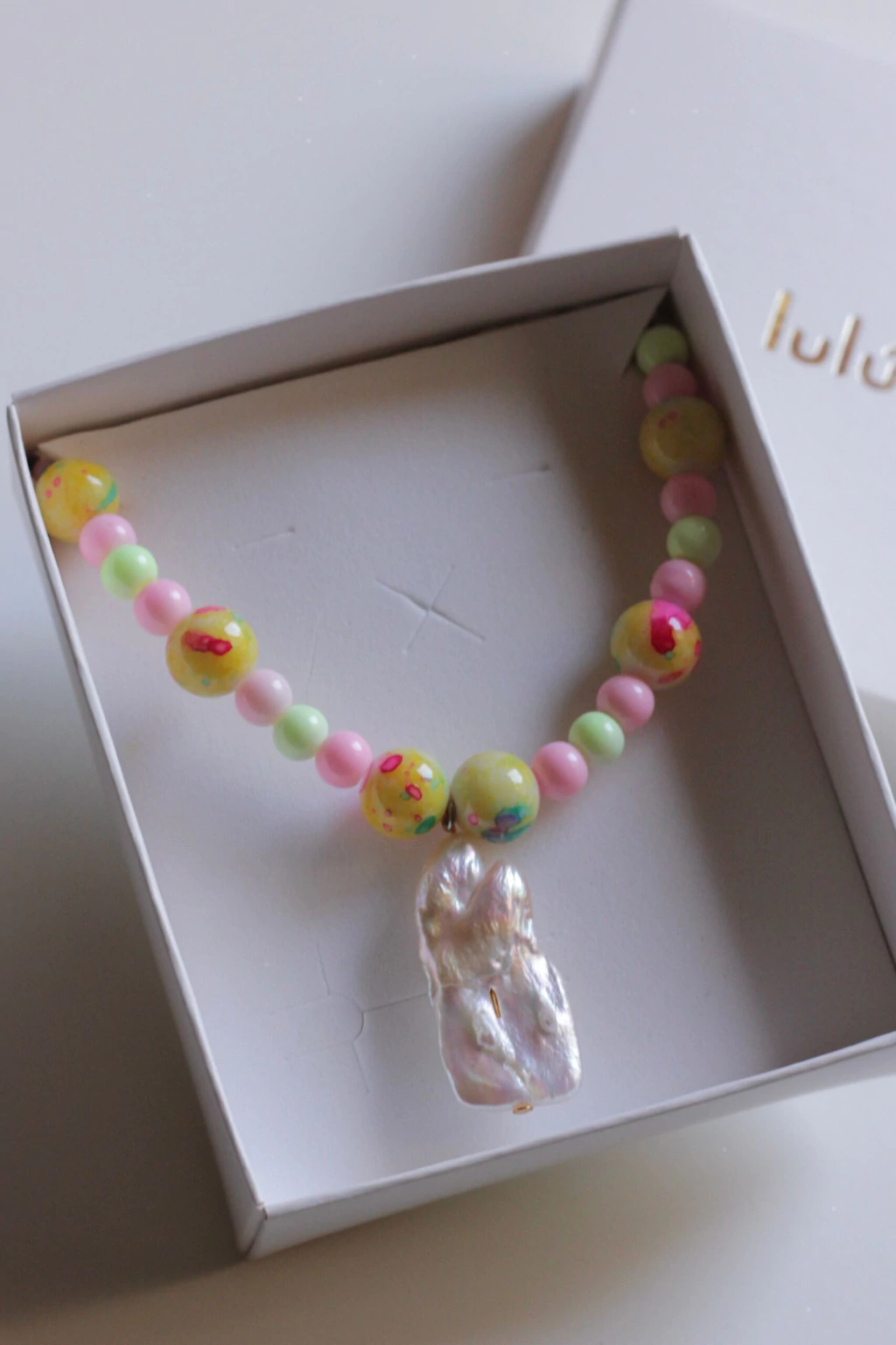 Collar con cuentas de vidrio color rosa y perla del Río en el medio.