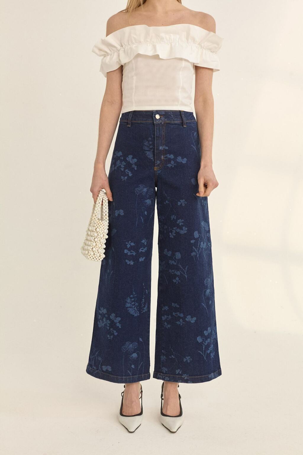 Este pantalon nos llevo muchisimo tiempo desarrollarlo, pero finalmente acá esta. El pantalon de denim tiene un corte de cintura alta, y tiene bolsillos traseros. El textil elegido es un denim elastizado con bastante cuerpo, y tiene una estampa grabada a laser en el pantalon imitando una estampa en cianotipo, Por lo tanto si tenias dudas si la estampa se lavaria con el tiempo: no ,no se lava, es permanente. La ubicacion de las flores puede variar segun el pantalon, a la foto.
