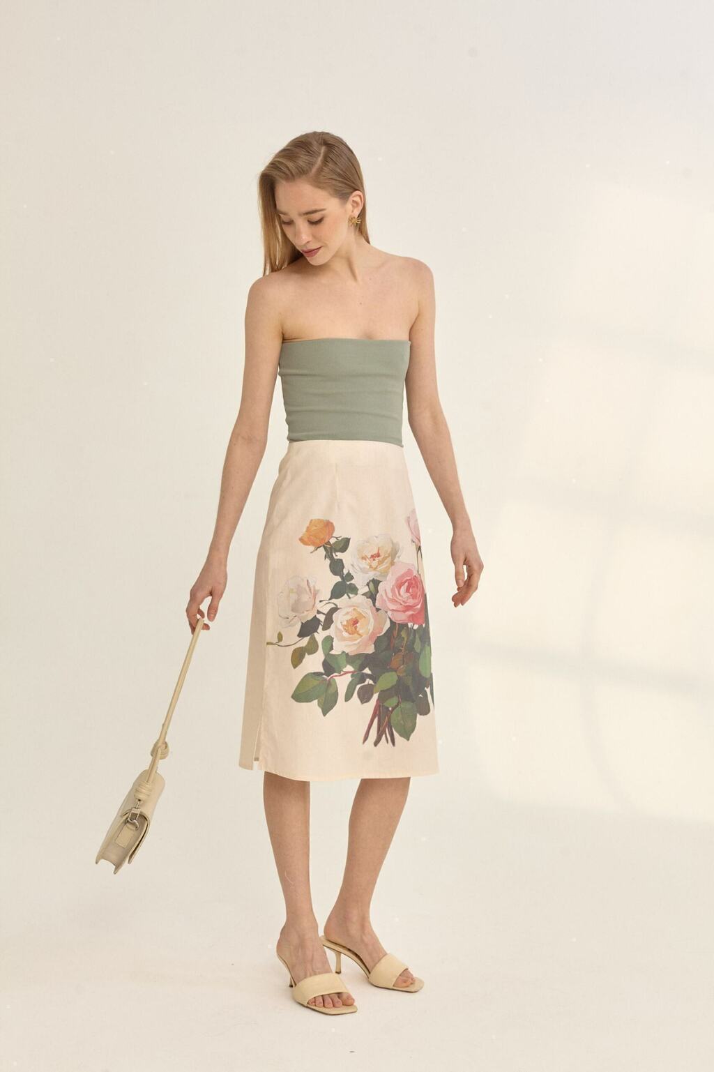 La falda Bouquet posee una estampa única esclusiva de Lulú. Es tiro alto, con pinzas de entalle para que su silueta recta calce mejor. Tiene un cierre en el centro de la espalda y posee cintas para poder colgarla en percha.