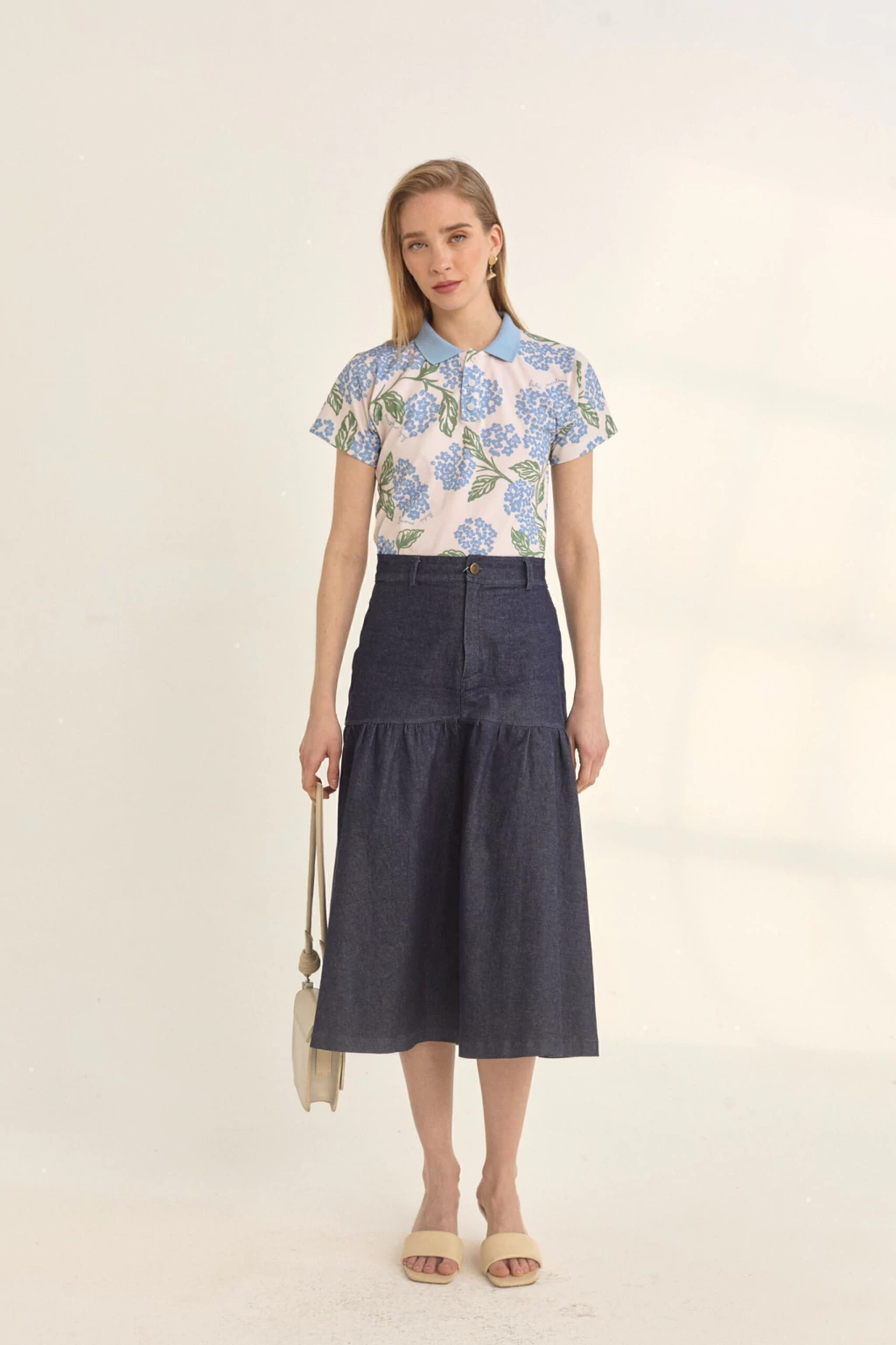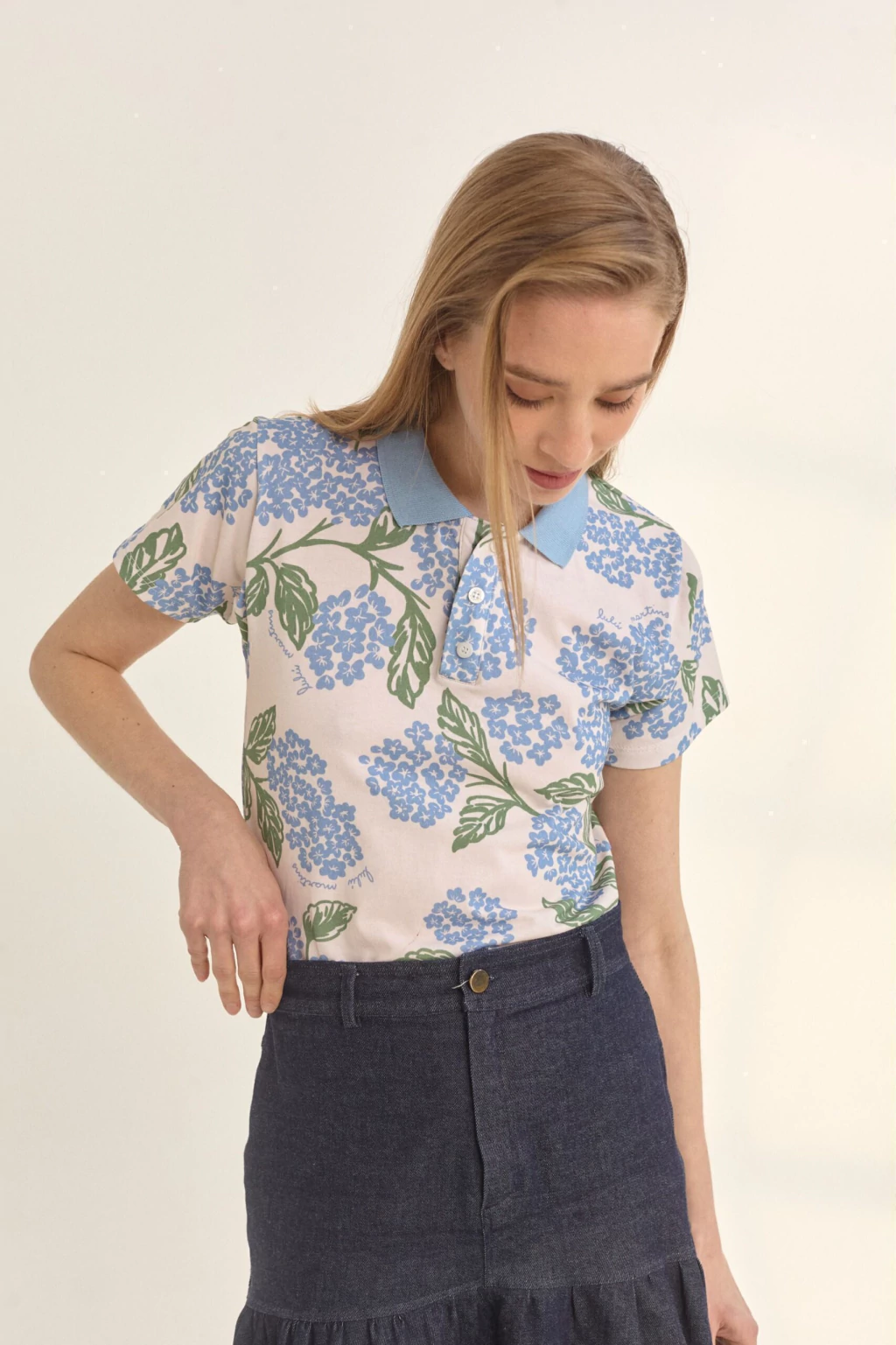 La remera Hortensias es una remera tipo chomba con cuello tejido a contratono como un detalle original. Posee una estampa por metro exclusiva de la marca, inspirada en las flores hortensias. Es de calce recto, por lo que si estás entre dos talles guiate por la medida de busto y elegí el más grande. El textil base es jersey de algodón, super fresco para el verano. Composición: 100% algodón.