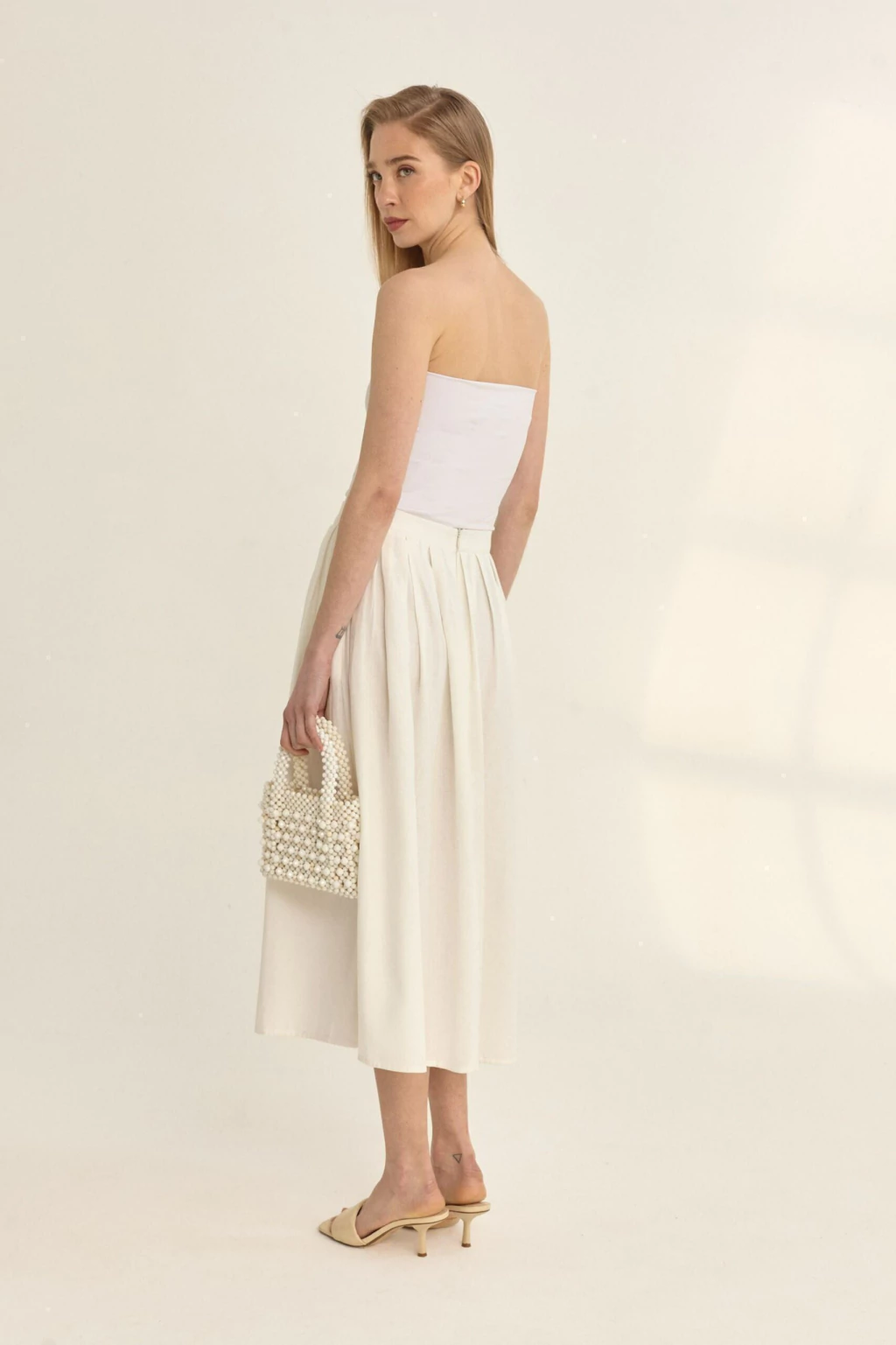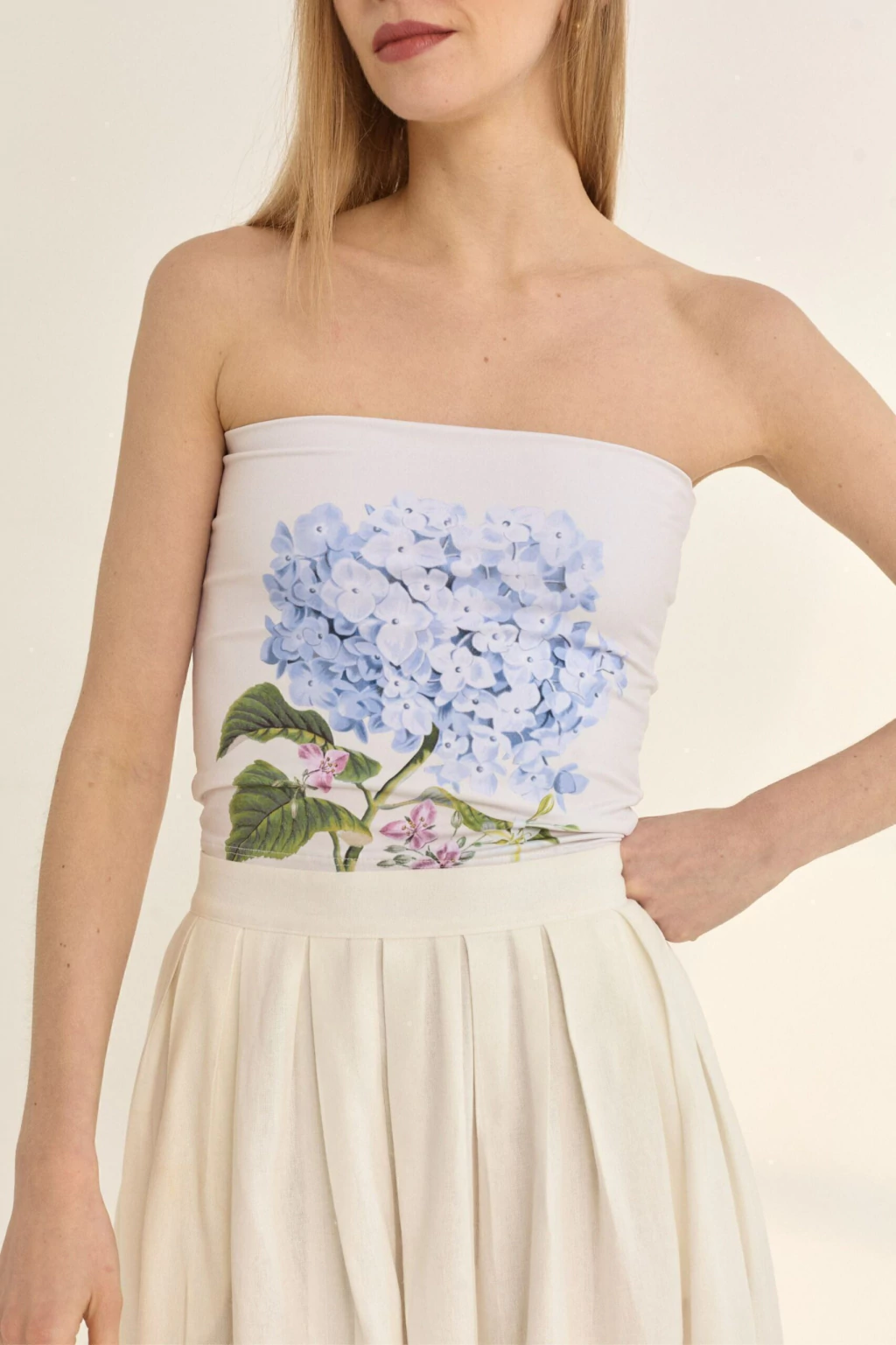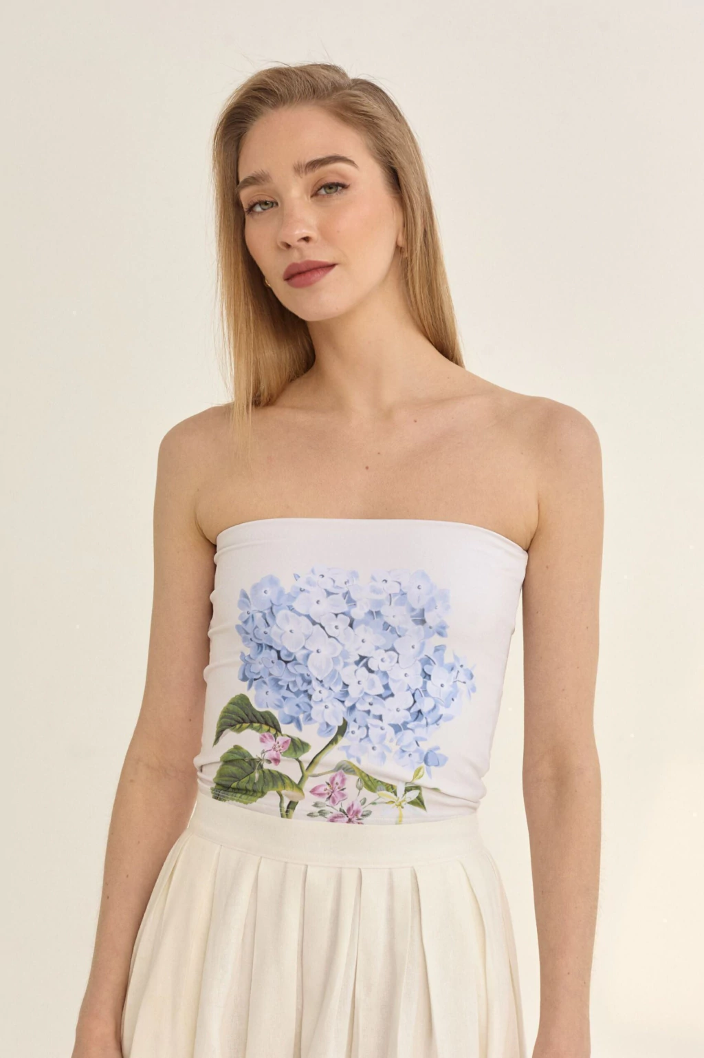 El top Hortensia blanco tiene una estampa única exclusiva de Lulú. Es un top strapless entallado que llega a la cintura. Si estás entre dos talles recomendamos elegir el más grande ya que se adapta al cuerpo. El textil es micropluma de poliester, suave al tacto.