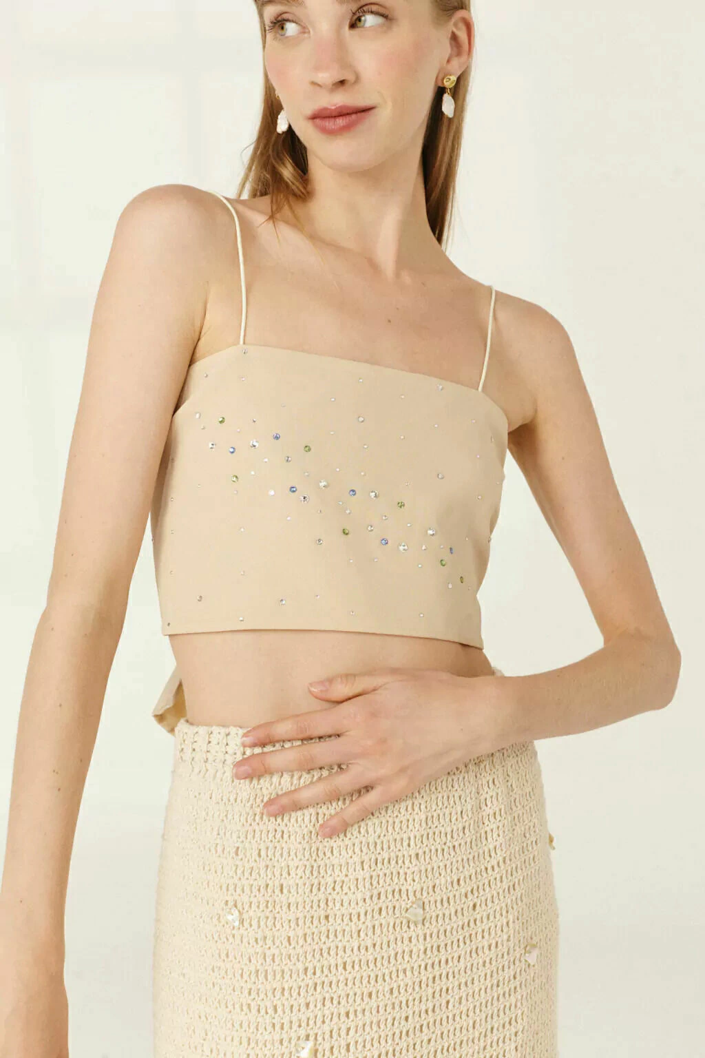 Top de gasa beige con breteles de cordón finitos. La gasa tiene colocados cristales de vidrio en todo su contorno y adelante forma una constelación en colores verde, celeste y plateado. Los cristales al ser de vidrio son muy brillantes. Se ata en la parte trasera con un nudo. Es un top Digno de una sirena que acaba de salir del mar!