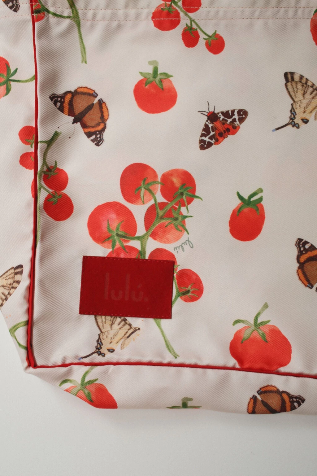 La tote bag Tomates posee una estampa exclusiva de la marca. Confeccionada en gabardina, con un ribete rojo en los laterales. Tiene un fuelle de 8cm y sus dimensiones son de 40 x 40cm.