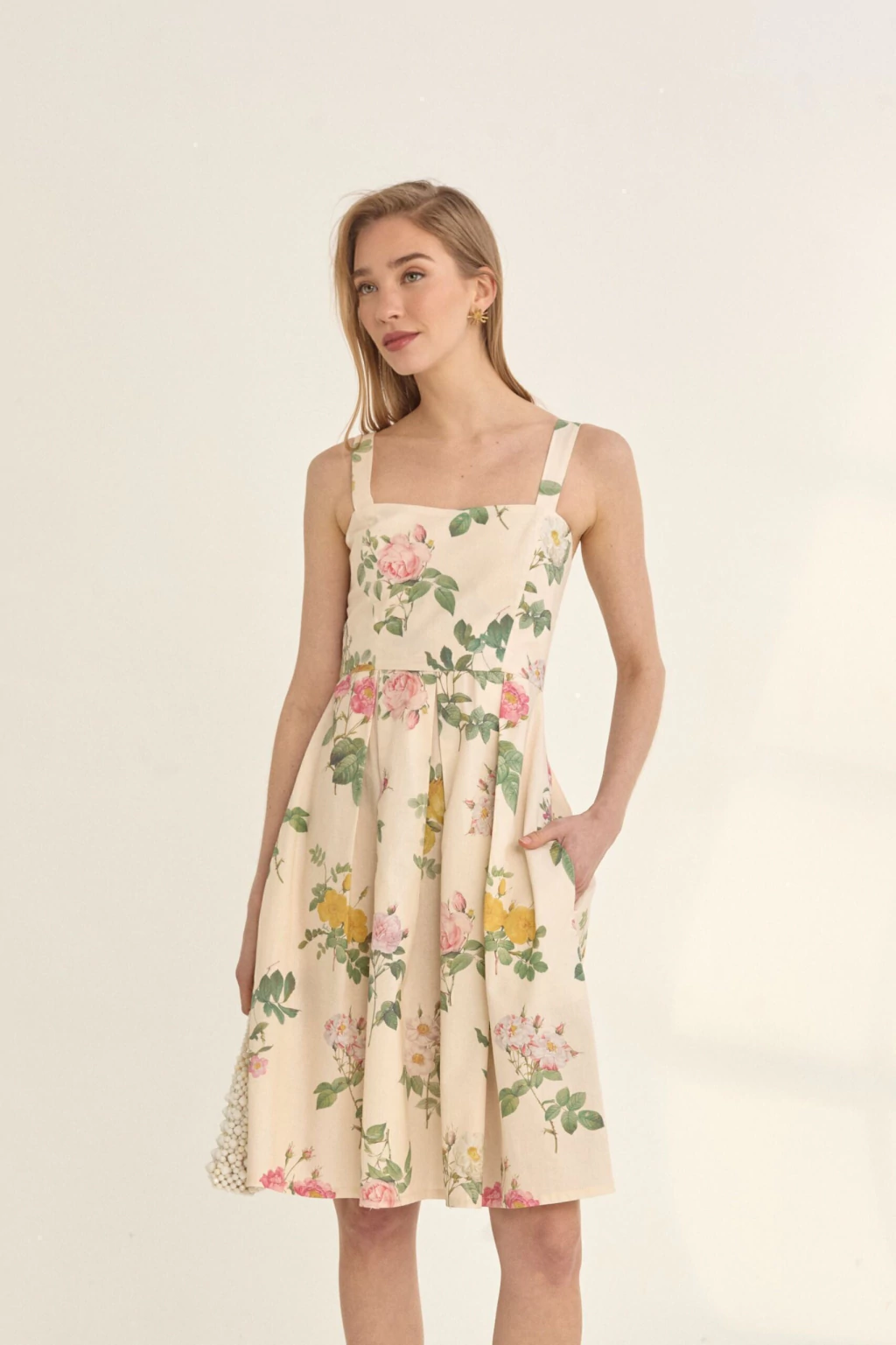 El vestido Anais tiene una estampa por metro exclusiva de Lulú. Con una parte superior entallada con breteles de la misma tela, y un cierre en el centro de la espalda que permite el acceso a la prenda. La falda posee tablas para generar una silueta tipo evasé. Recomendamos que elijas tu talle en base a tu contorno de busto, para un mejor calce. La tela base es un lino camisero mezcla con algodón, lo cual hace que sea una tela super fresca y liviana para el verano.