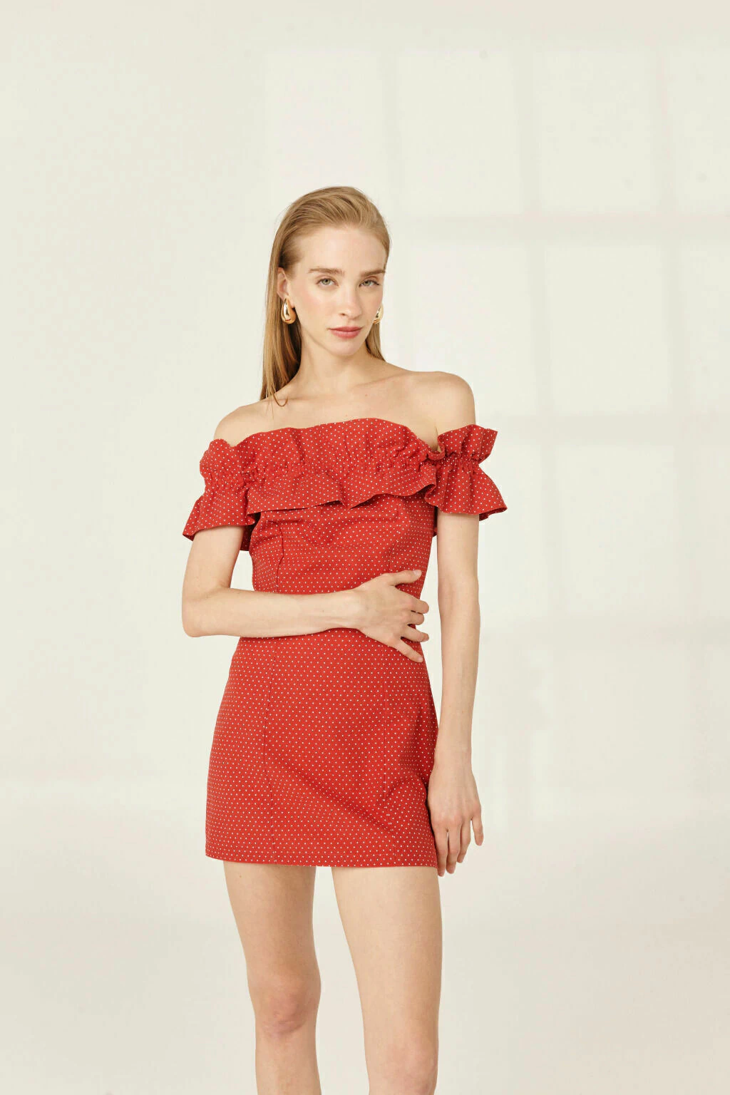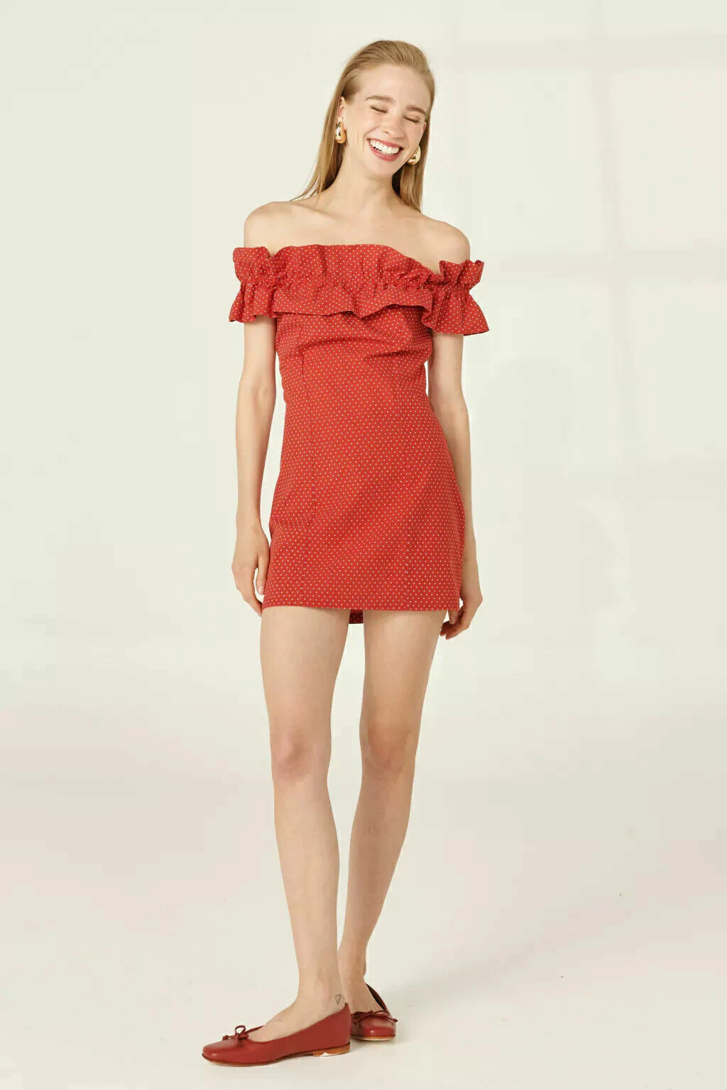 El vestido Guarana es un vestido corto entallado, con un bolado en el escote, que cubre los hombros, y esta ajustado con un elastico interno en los hombors para sostener el vestido. El vestido tiene un cierre invisible en el lateral, que se abre para poder pasarlo.