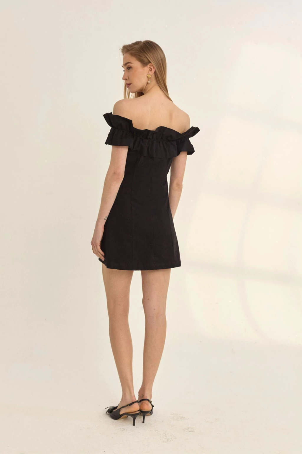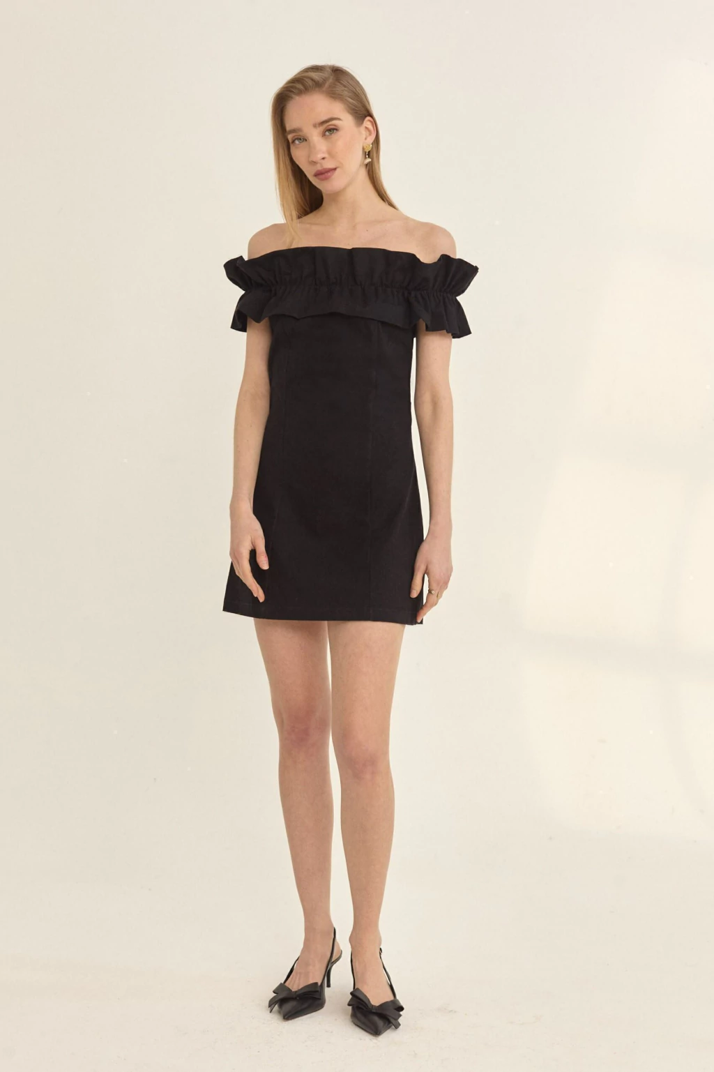 El vestido Noir es un modelo de calce entallado, corto con un volado en el escote que cubre los hombros, y esta ajustado con un elastico interno para sostener el vestido. Posee un cierre invisible en el lateral para un acceso más cómodo. Su textil base es gabardina de algodón elastizada, que hace que sea super cómodo y se ajuste al cuerpo.