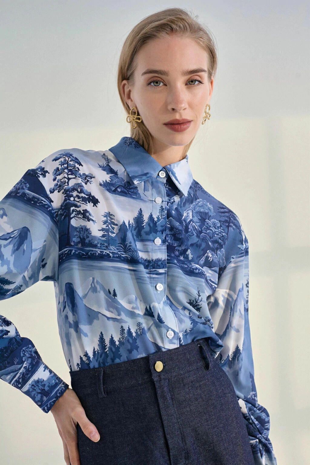 La camisa Calafate esta realizada con una estampa exclusiva de la marca, con una ilustracion inspirada en los paisajes del sur de argentina, en color azul ya que nos hacia acordar al area de Calafate.