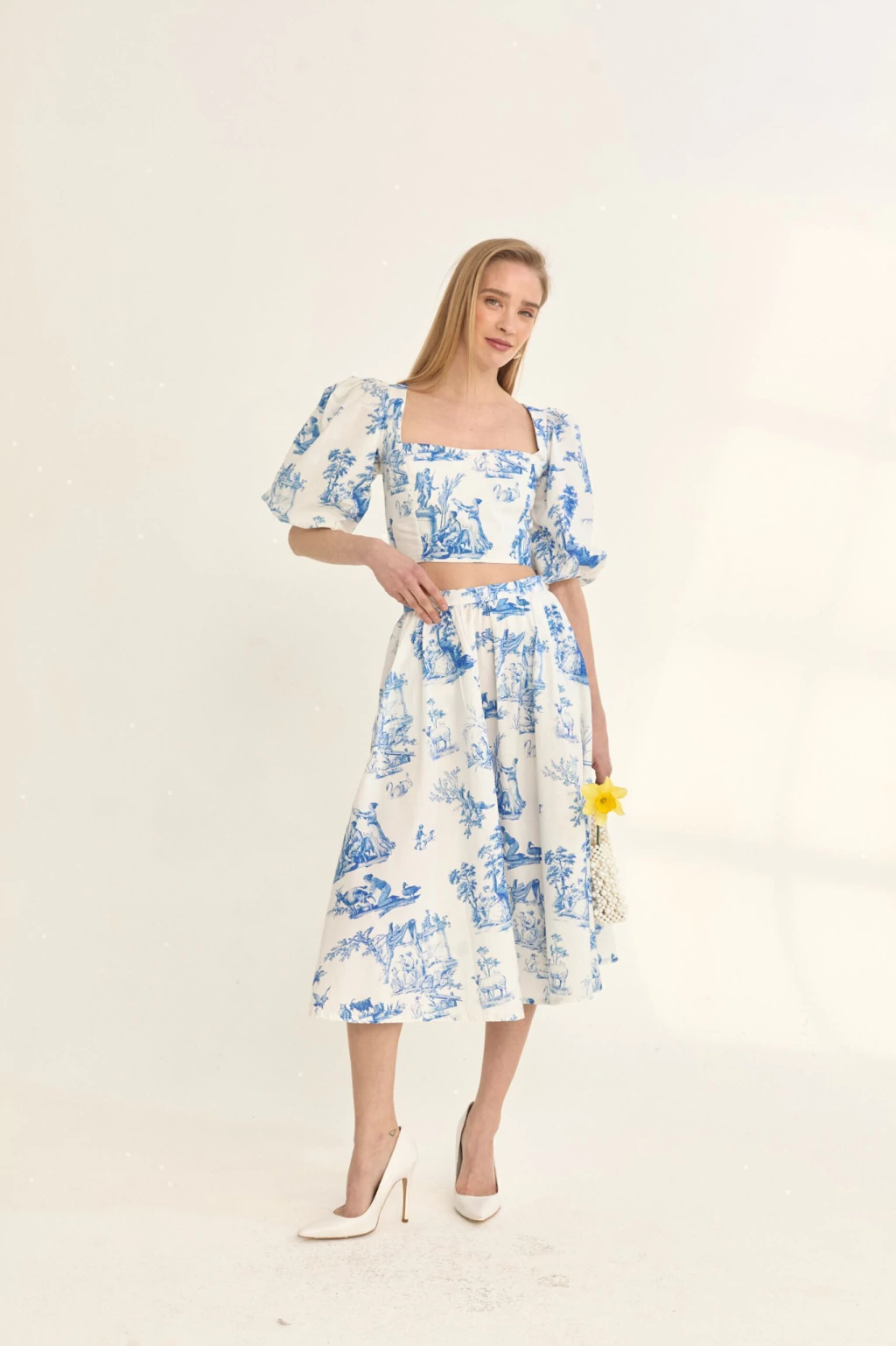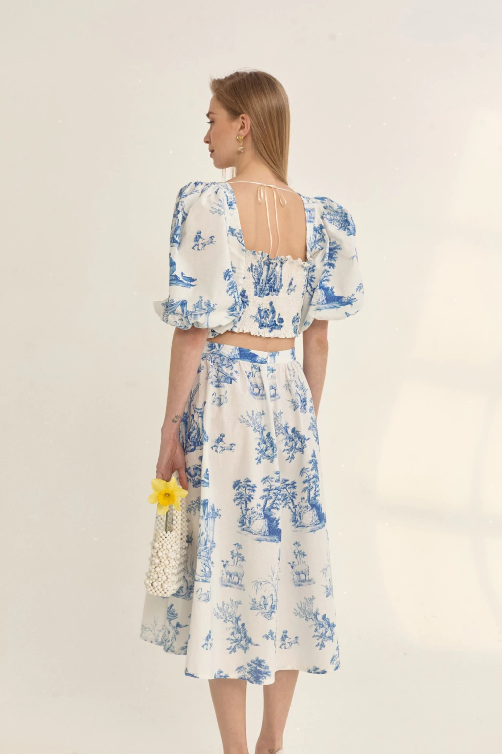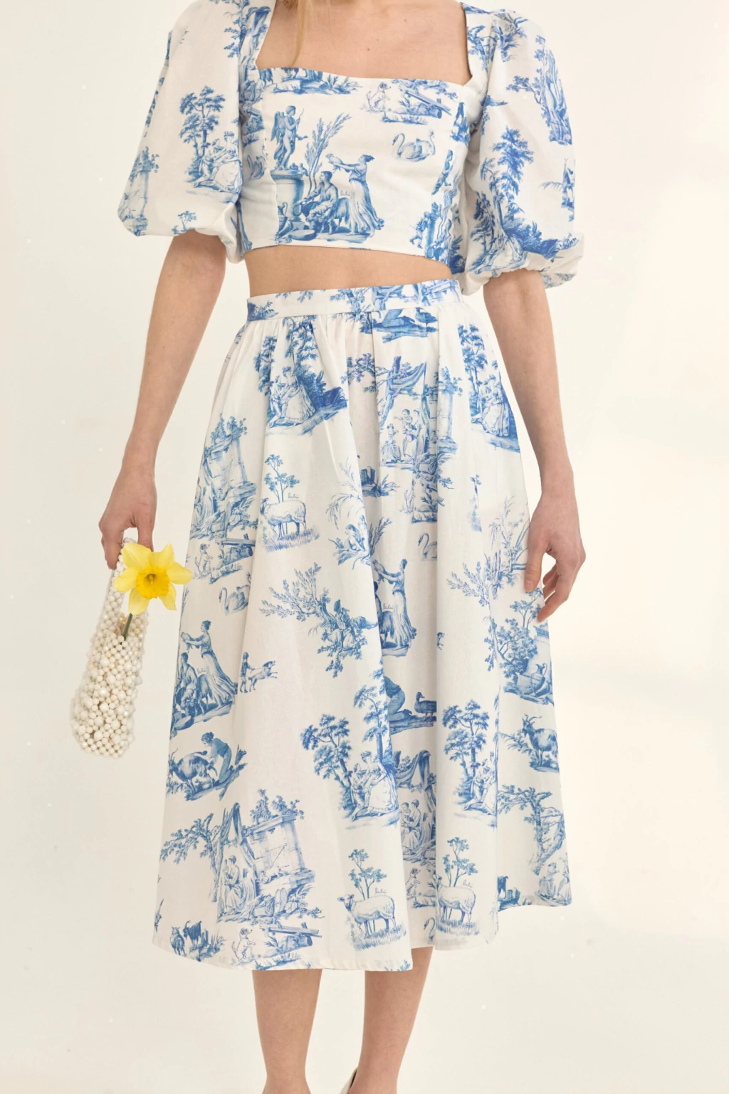 La falda Jouy posee una estampa por metro exclusiva de Lulú, que retrata escenas pastorales, mitológicas o cotidianas clásicas de Francia. Posee una cintura tiro alto con cierre en el centro de la espalda. Silueta evasé, con bolsillos en los laterales. El textil es tusor de algodón elastizado, lo cual hace que sea fresca para el verano.