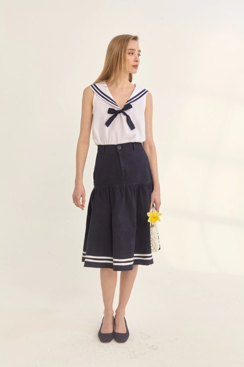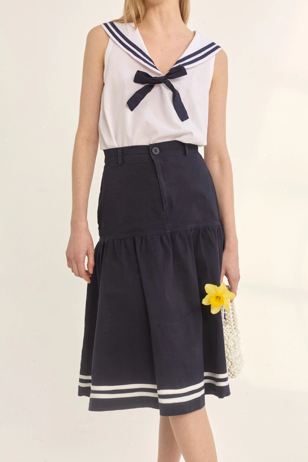 La falda Marine está confeccionada en gabardina de algodón, con unas cintas de algodón que le dan un detalle marinero en la parte del ruedo. Su parte superior es ceñida al cuerpo y tiro alto, lo cual genera una silueta muy femenina, y desde la cadera tiene vuelo para más comodidad. Al ser de algodón elastizado es fresca y cómoda para el verano.