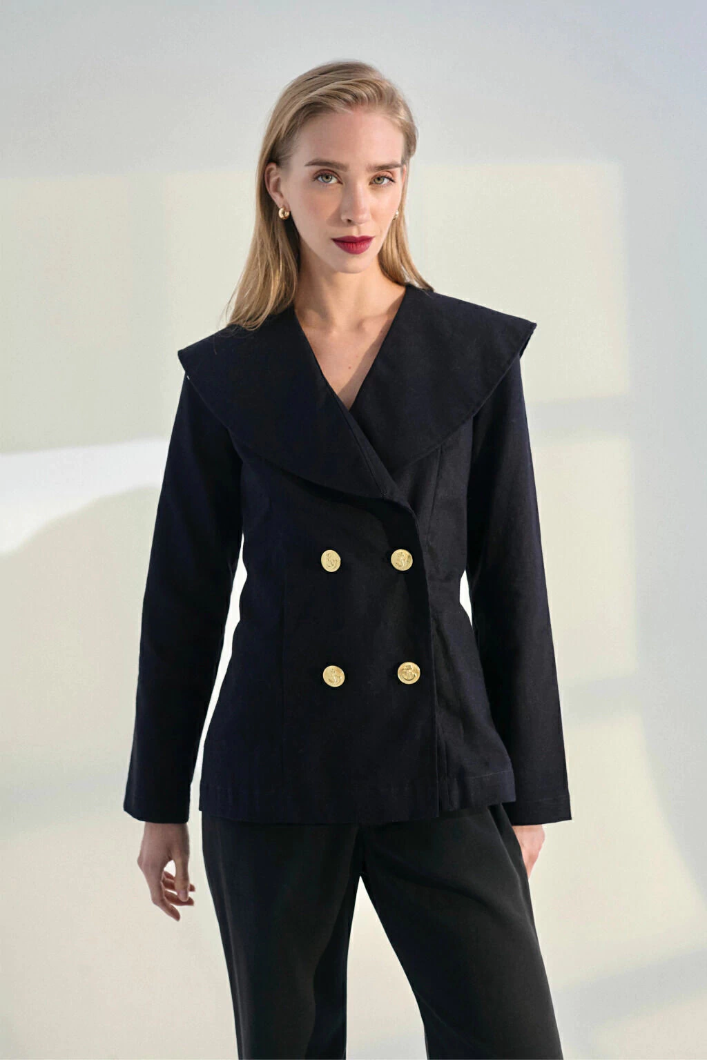 El saco barco es un blazer sastrero estilo marinero entallado. Tiene un cierre cruzado con 4 botones dorados marineros. El textil es un lino/algodon grueso, por lo que podemos usarlo en invierno, siendo una fibra termoregulable, que significa que en invierno abrigan y en verano son frescas. La vas a poder usar en invierno, en media estación y en verano.